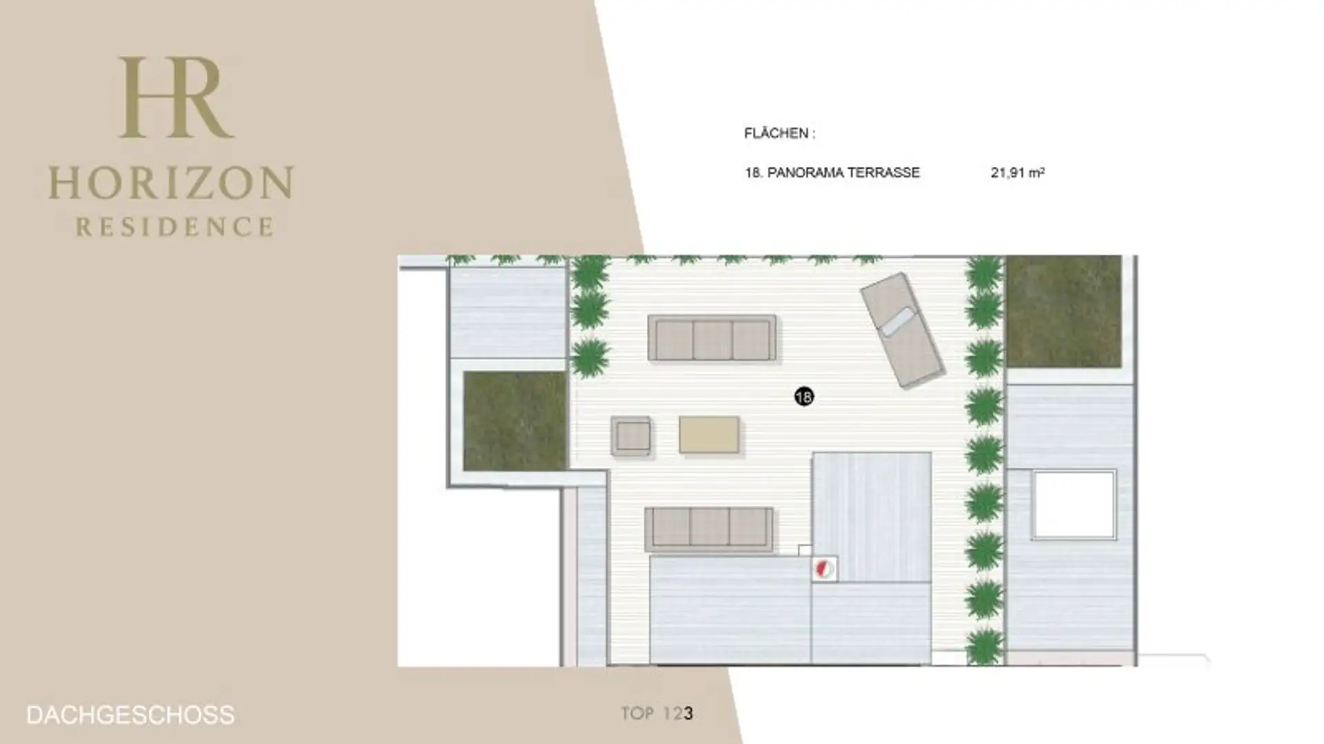 * Dachterrassen mit Vorbereitung für individuelle Kundenwünsche wie Dusche Whirlpool, Outdoor-Küche. Großformatige Feinsteinzeugbeläge für eine pflegeleichte und stilvolle Gestaltung.