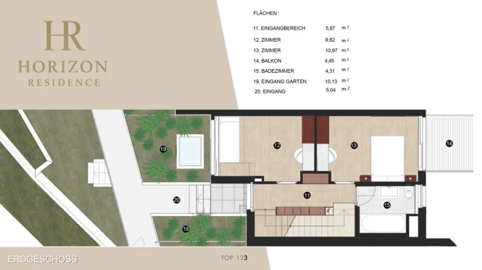 Erdgeschoss: Eingang Garten, Vorraum, Schlafzimmer, Schlafzimmer mit Zugang zum Balkon, Bad mit WC