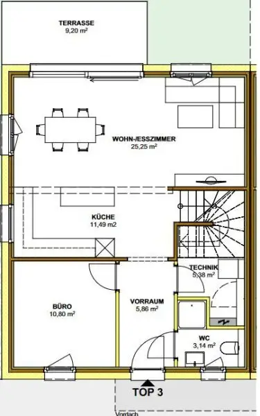 Raumaufteilung im Erdgeschoß / Wohnbereich: Eingangsbereich, Technikraum, Büro, großzügiger Wohn-Essbereich mit Küche und Ausgang auf die Terrasse, 1 WC mit Anschlussvorbereitung für ein Handwaschbecken und eine Dusche