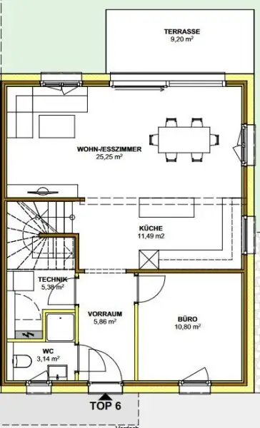 Raumaufteilung im Erdgeschoß / Wohnbereich: Eingangsbereich, Technikraum, Büro, großzügiger Wohn-Essbereich mit Küche und Ausgang auf die Terrasse, 1 WC mit Anschlussvorbereitung für ein Handwaschbecken und eine Dusche