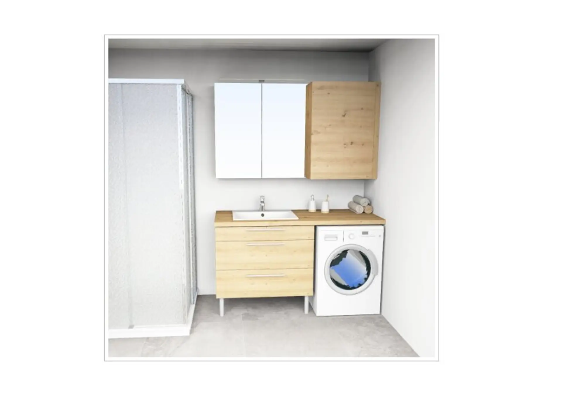 Das moderne Badezimmer ist über das Wohnzimmer zu begehen und ist mit einer Dusche, einem Handwaschbecken, einer Toilette und einem Waschmaschinen-Anschluss ausgestattet. Das maßgeschneiderte Badezimmer vom Tischler bietet mit einem eleganten Verbau inklusive Spiegelschrank und Spiegelleuchte jede Menge Stauraum. Eine hochwertige Glasduschwand rundet das stilvolle Ambiente ab.