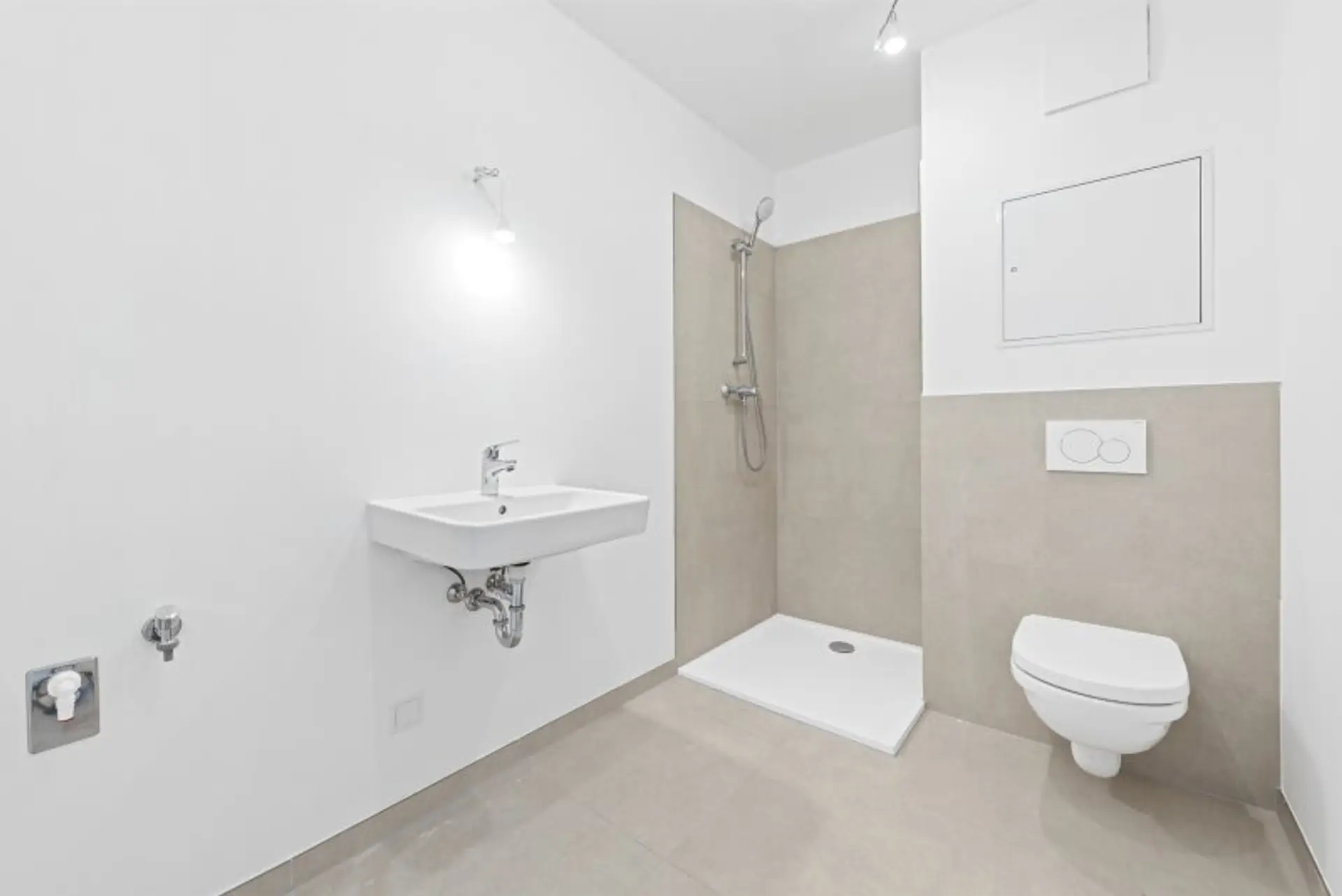 Neben dem Eingangsbereich liegt das moderne Badezimmer mit fast 5 m² Größe, welches mit einer Duschkabine, einem Handwaschbecken, einer Toilette und einem Waschmaschinen-Anschluss ausgestattet ist.