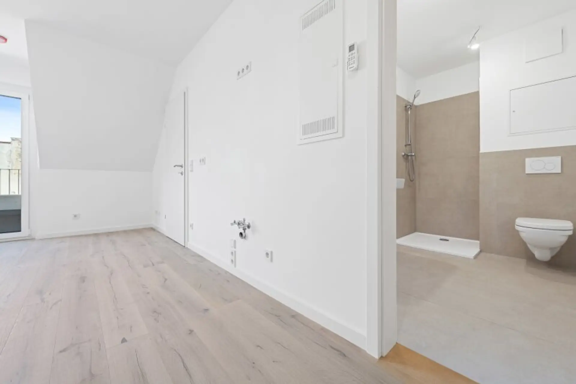 Nach dem Betreten der ca. 31, 72 m² großen 2-Zimmer-Wohnung befindet man sich im offen gestalteten Vorraum, welcher idealen Platz für eine Garderobe, oder einen Schrank bietet. Die angeschlossene Wohnküche mit etwa 16 m² bietet viel Licht dank bodentiefen faltbaren Fensterflächen sowie einem schmalen Balkon mit 2,56 m² Größe. Im Wohnbereich lassen sich eine Couch und ein kompakter Essbereich wunderbar einrichten. Sämtliche Anschlüsse für die zukünftige Planung seiner individuellen Küchenzeile sind natürlich vorbereitet.