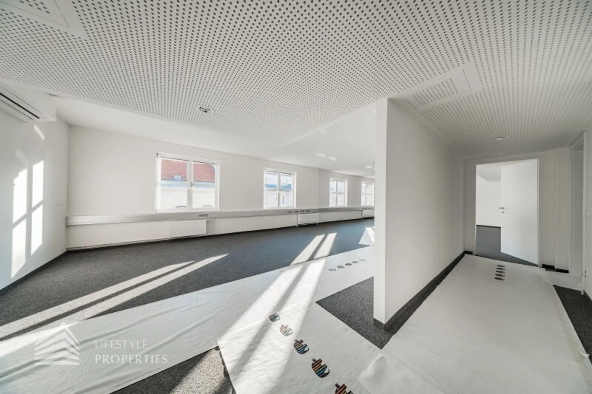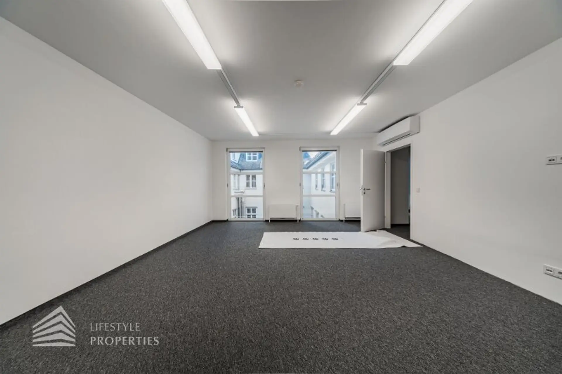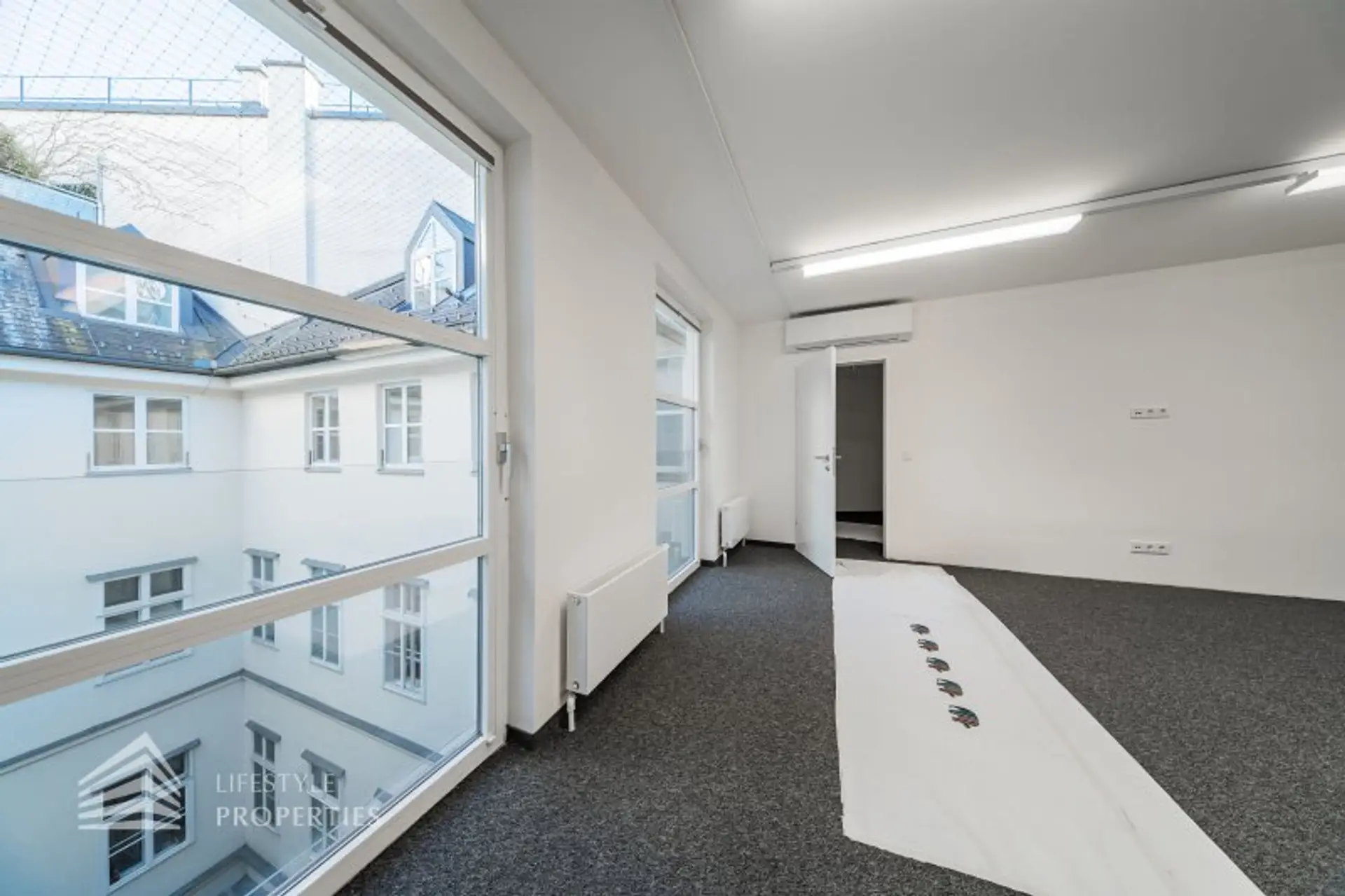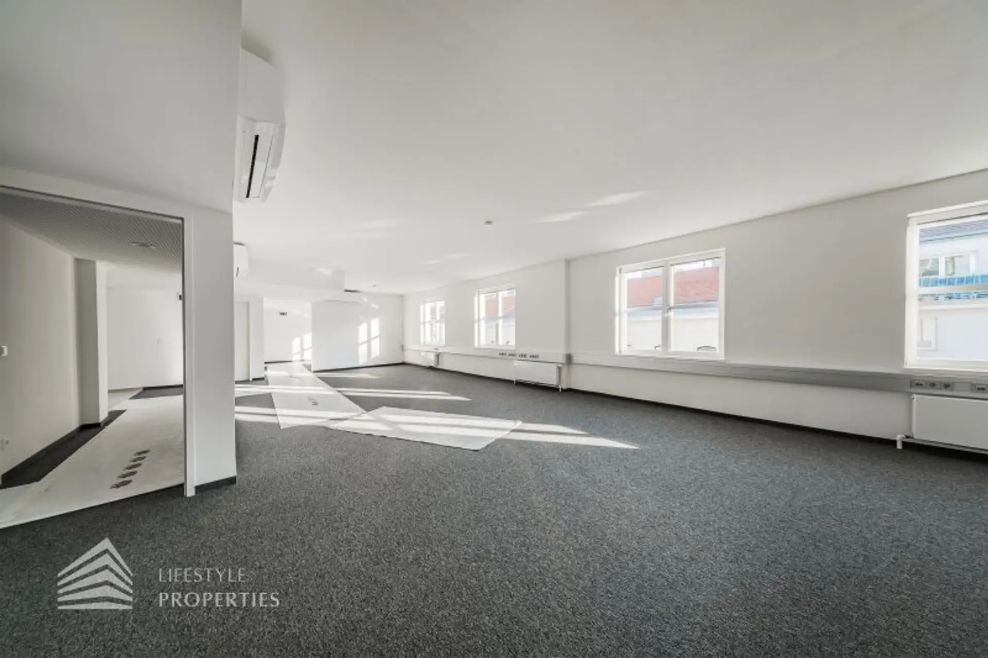 Die gesamten Räume sind klimatisiert. Bei gewünschten Raumaufteilungen durch Glaswände und Glastüren erhöht sich die monatliche Bruttomiete um 556,85.- Euro.