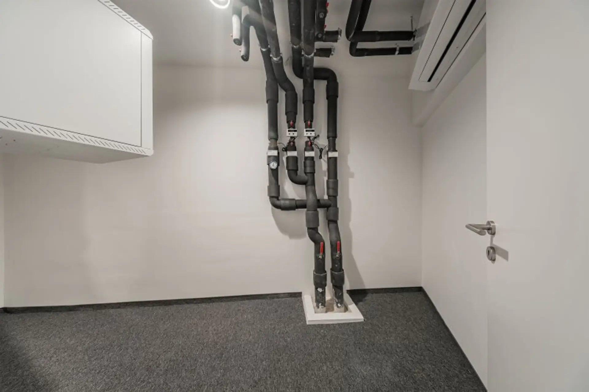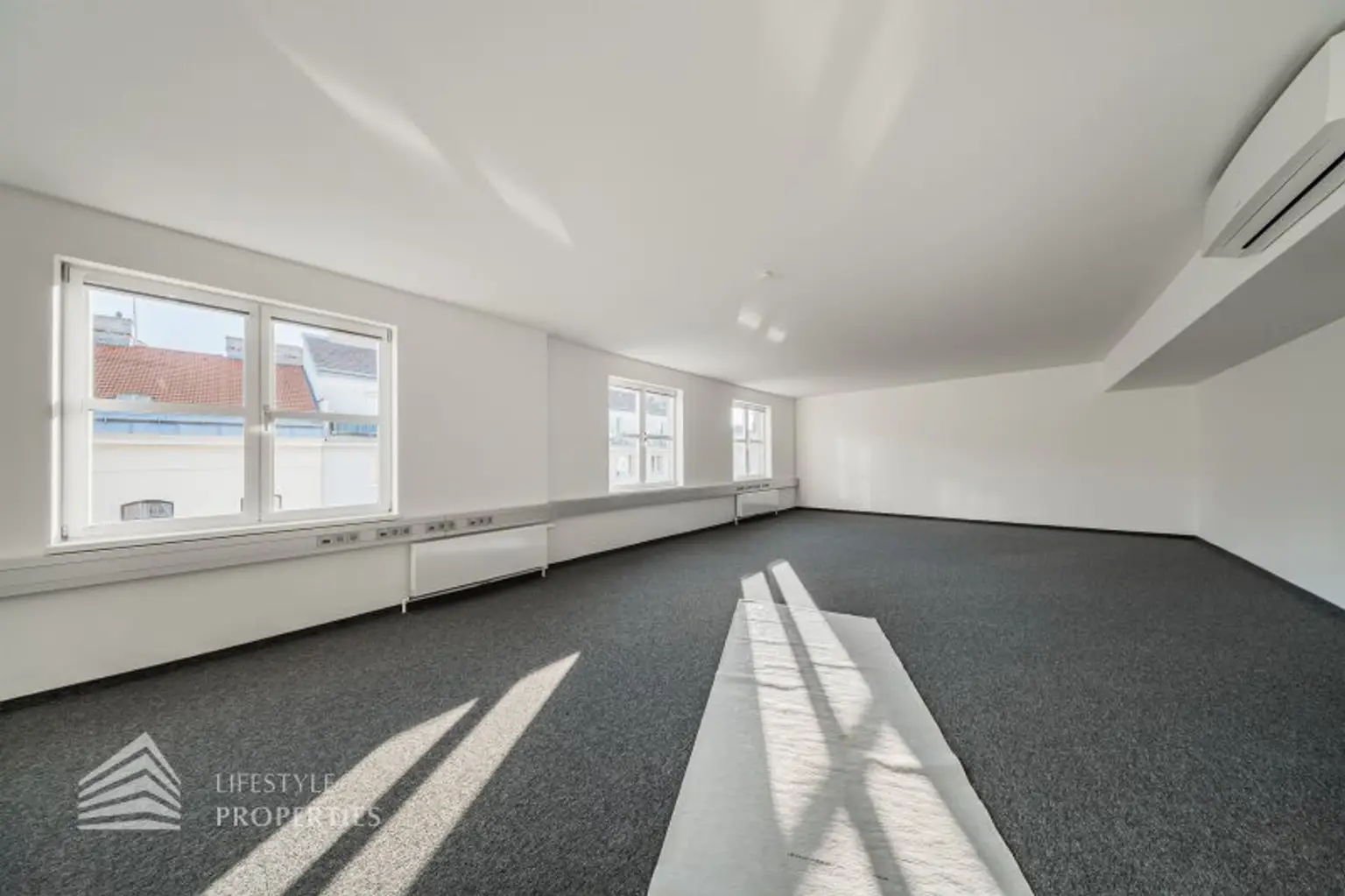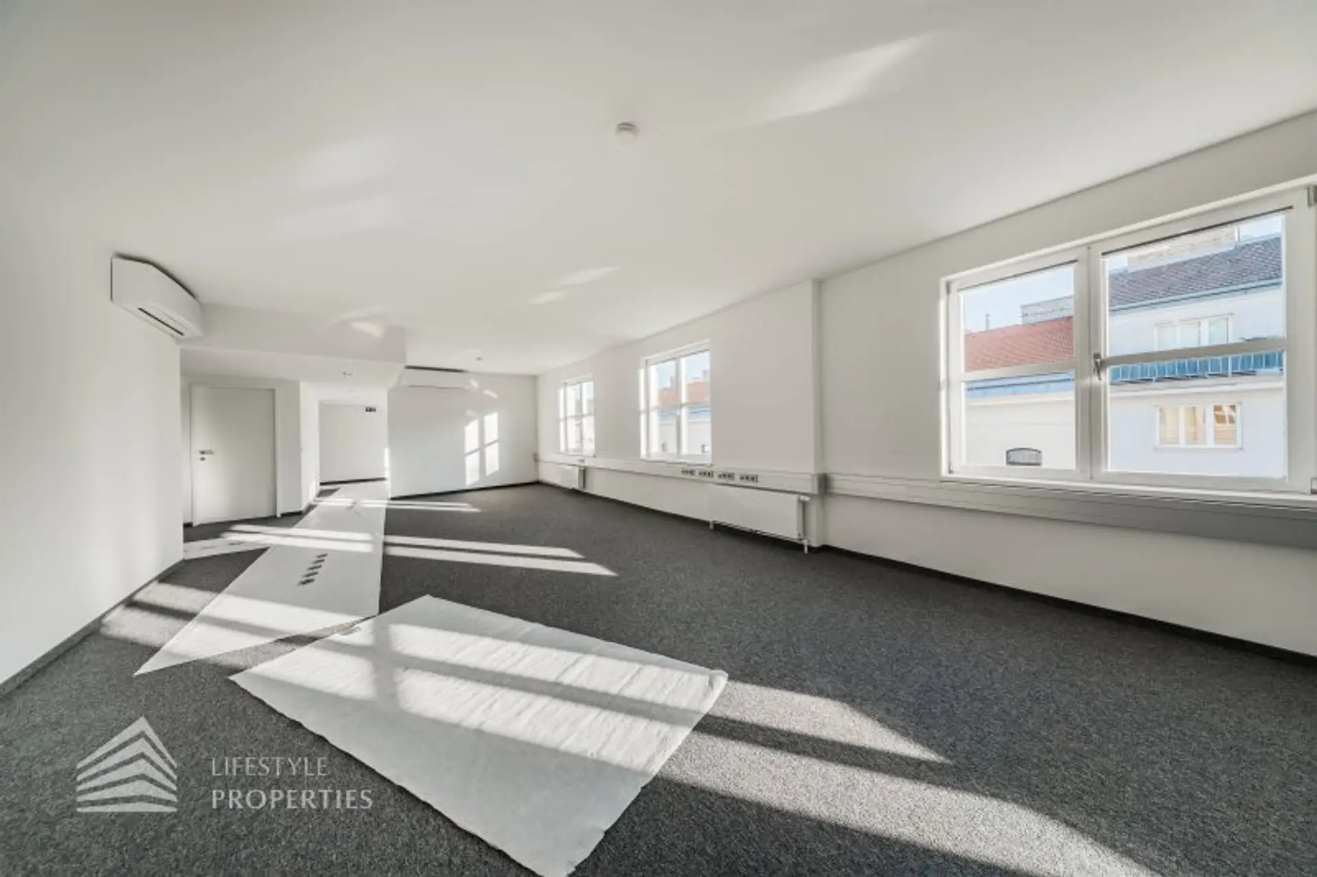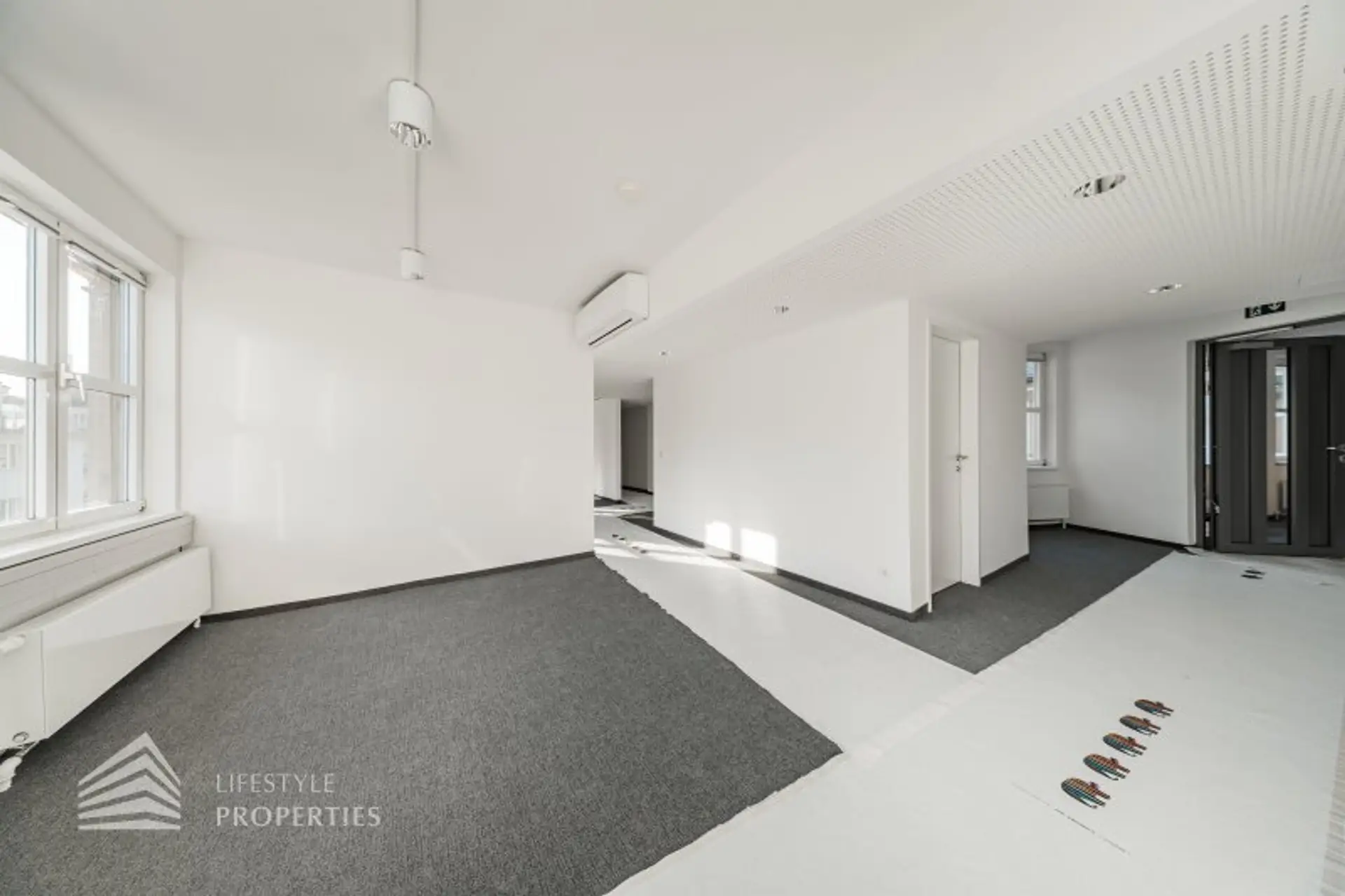 Die gesamten Räume sind klimatisiert. Bei gewünschten Raumaufteilungen durch Glaswände und Glastüren erhöht sich die monatliche Bruttomiete um 556,85.- Euro.