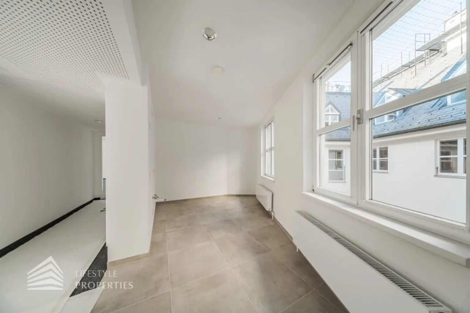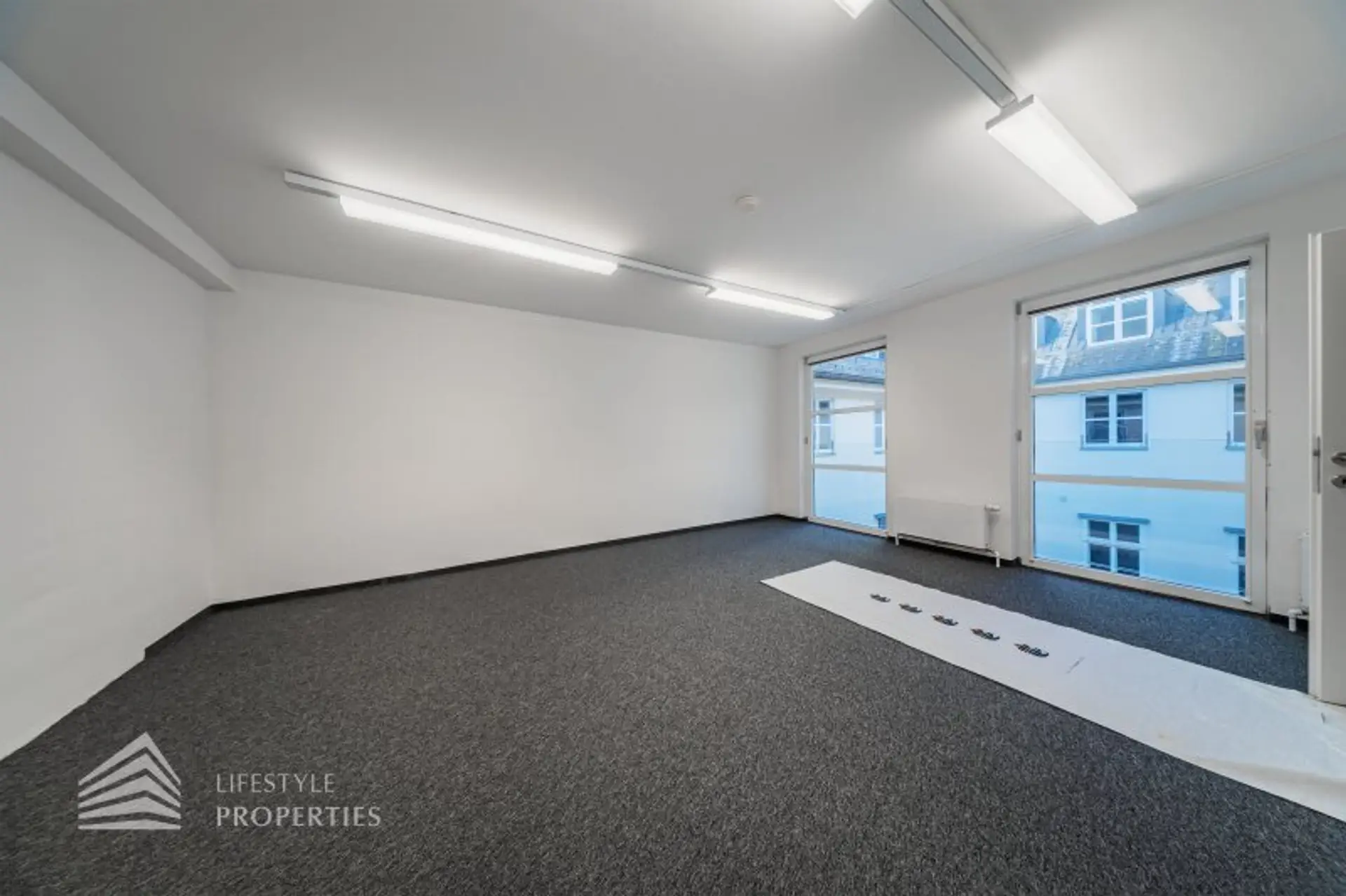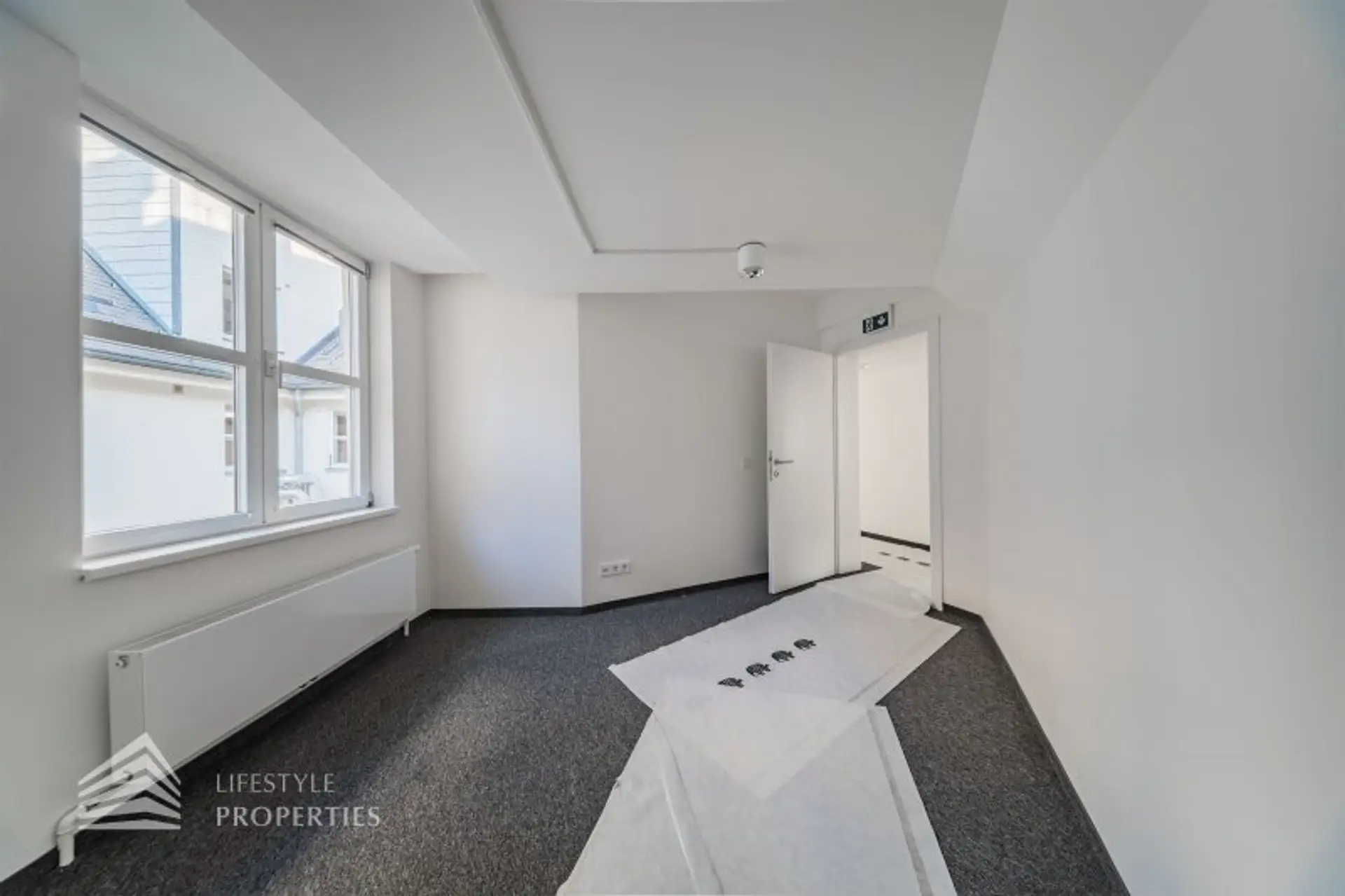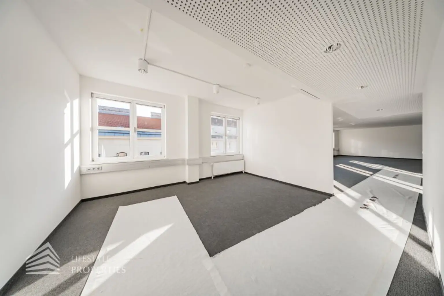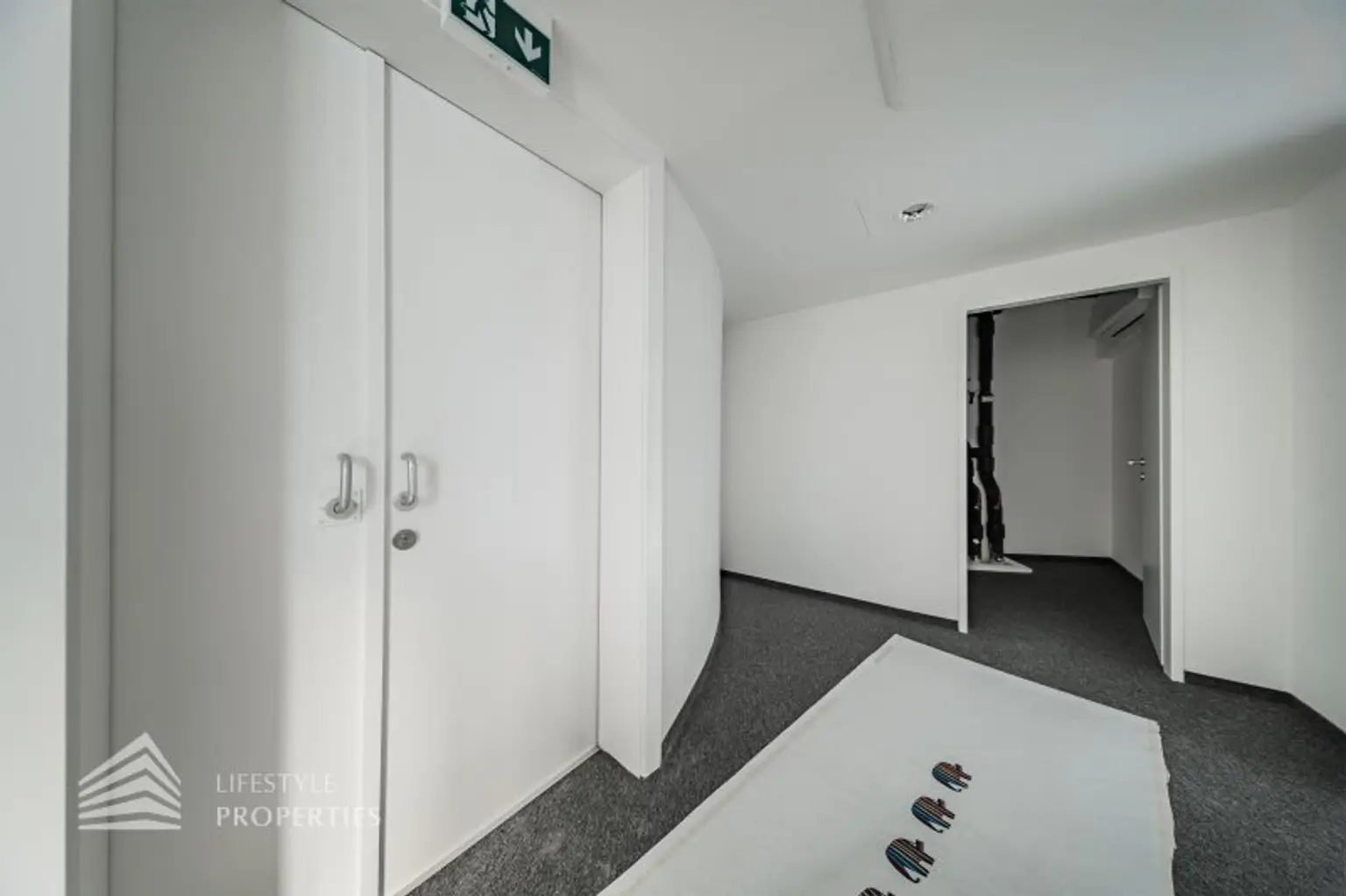 Beim Betreten des Büros steht man direkt im ca. 25 m² großen Vorraum, dieser mit dem angrenzenden Büro geteilt ist. Beim Eingang befindet sich der ca. 28 m² große Empfang. Durch einen ca. 13 m² langen Gang gelangt man zu den einzelnen Büroräumen. Auf der rechten Seite des Ganges befindet sich ein Sozialraum mit einer Teeküche, die Toiletten für die Damen und Herren. Durch einen weiteren Vorraum erreicht man den Serverraum und das Besprechungszimmer. Die Fläche des Heizraumes wird auf vier Einheiten aufgeteilt.