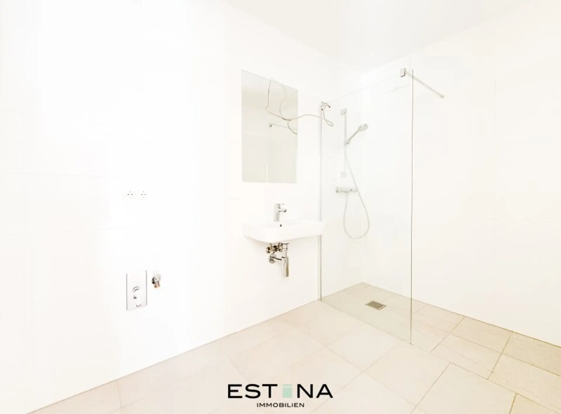 - Badezimmer mit Walk-In Dusche, Waschbecken und Waschmaschinenanschluss