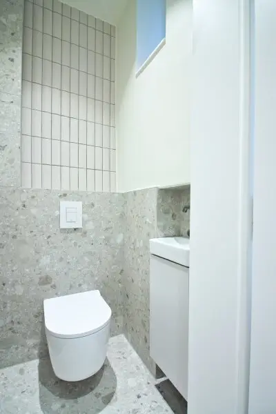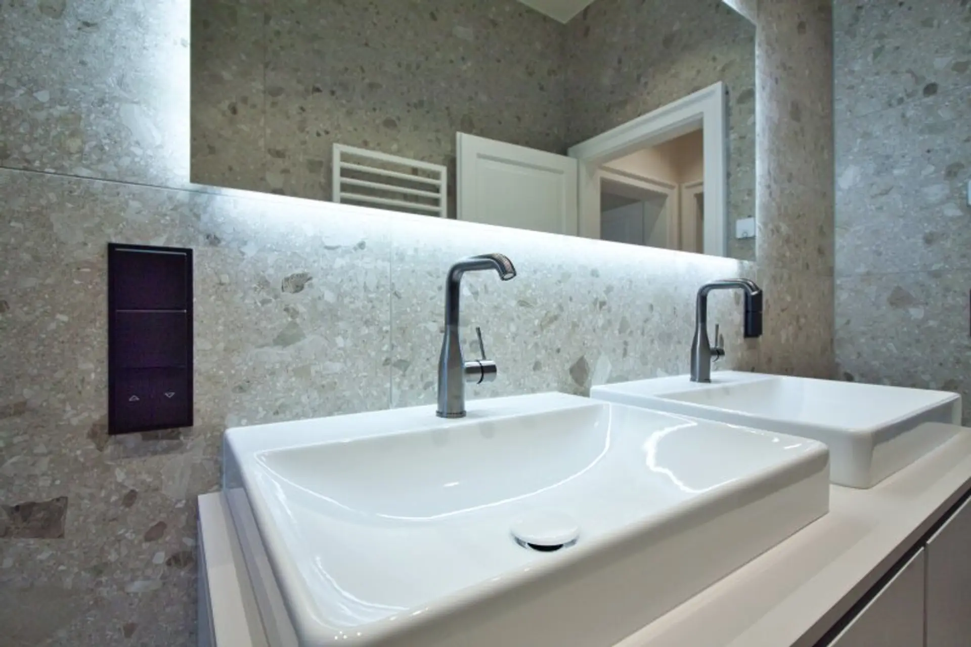 Der Wohnbereich überzeugt mit rund 22 m² und ist besonders hell und großzügig gestaltet. Gegenüber liegt die separate Küche, die somit funktional und optimal angeordnet ist. Direkt daneben befindet sich das zweite Badezimmer, ausgestattet mit Doppelwaschtisch, einem weiteren Waschmaschinenanschluss, Handtuchheizkörper und WC. Beide Bäder wurden mit hochwertigen Armaturen von Grohe und Hansgrohe ausgestattet und stilvoll umgesetzt. Auch die Fliesen sind ein absoluter Hingucker und unterstreichen das exklusive Ambiente.