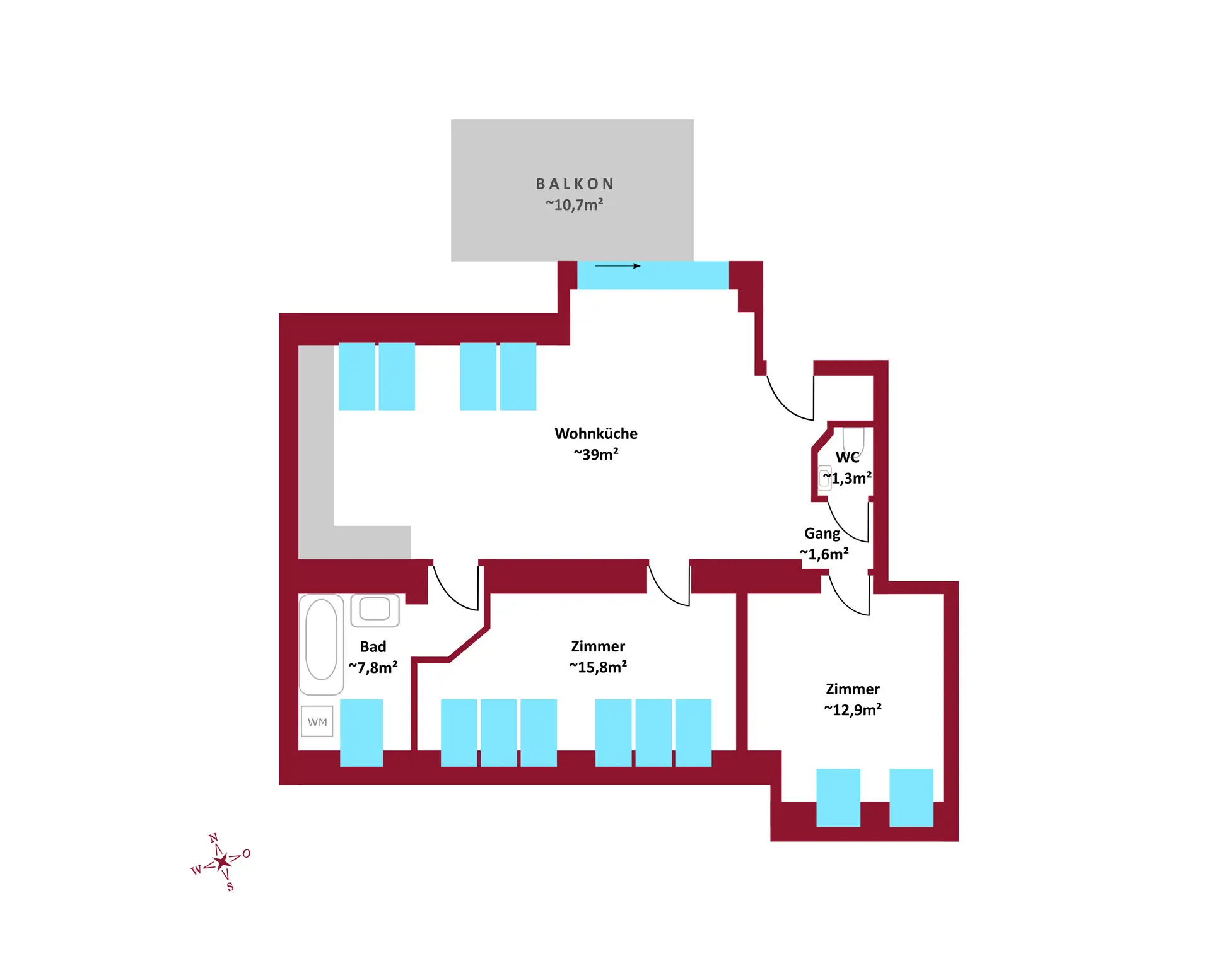 Die 3 Zi. DG- Wohnung mit ca. 78,26 m² Wohnfläche und ca. 10,67 m² Balkon teilt sich wie folgt auf: