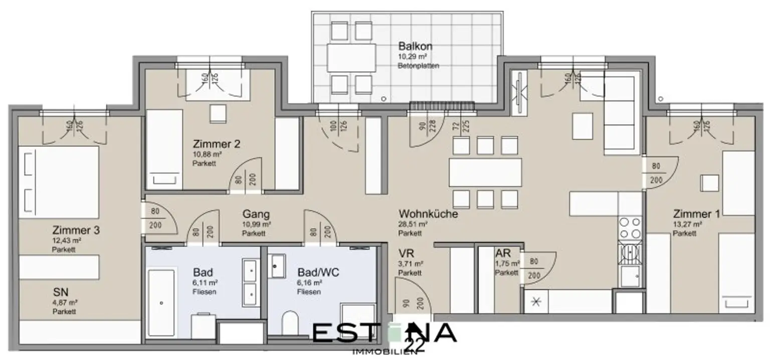 Die angeführten Fotos sind Beispielbilder einer bereits fertiggestellten Wohnung oder KI Visualisierung im Projekt.