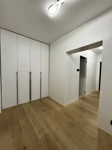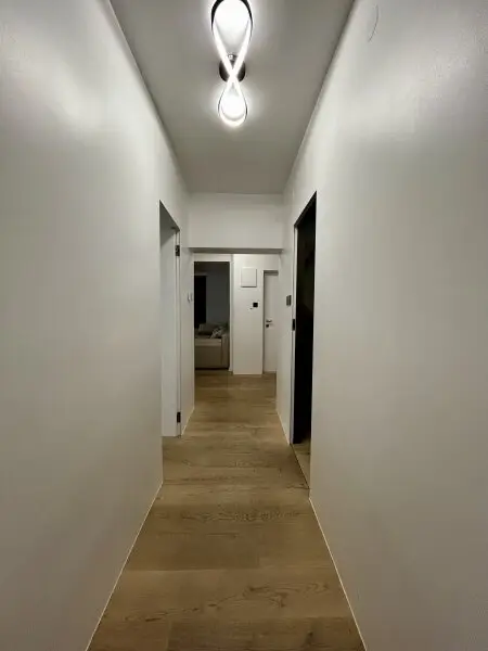 Links vom Eingangsbereich gelangt man über einen gangartigen Vorraum zu den beiden Schlafzimmern, den Nassräumen sowie dem Abstellraum.