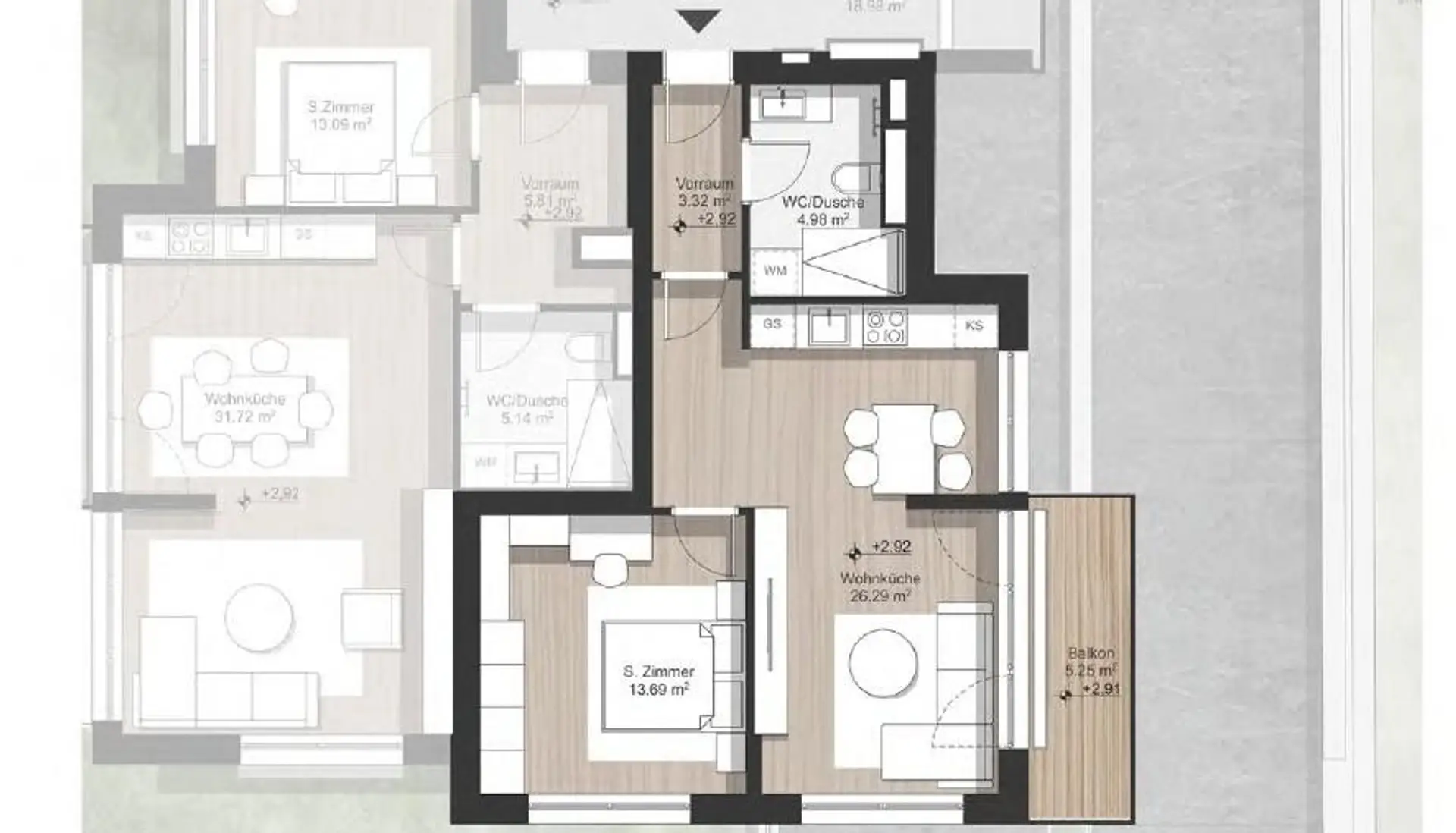 • Wohnzimmer mit offener Küche (26,29m²)