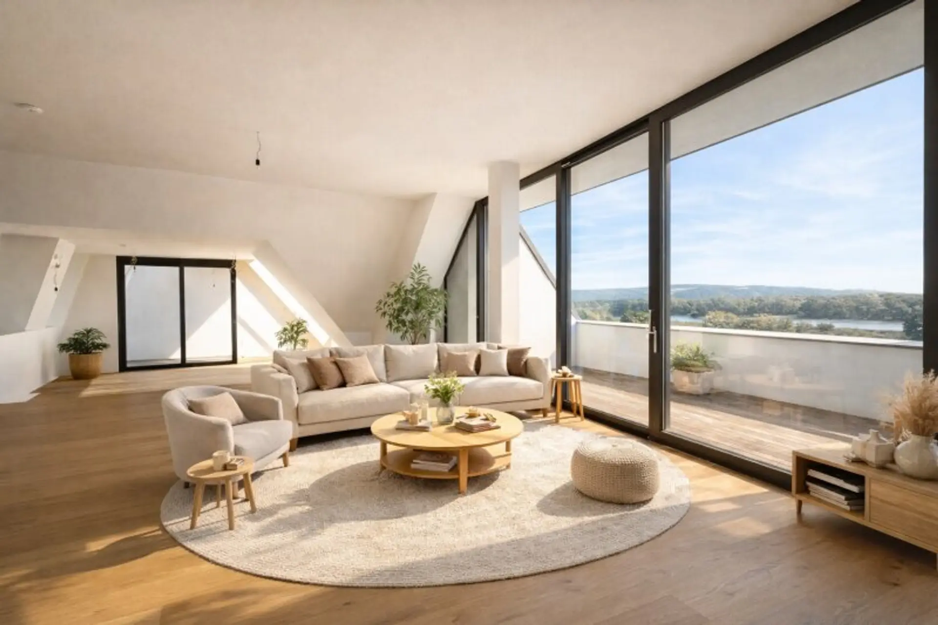 Herzstück der unteren Ebene ist ein ca. 102 m² großes Wohn- und Esszimmer, das sich harmonisch in Wohn- und Küchenbereich gliedert. Von der offen gestalteten Wohnküche aus betreten Sie zwei sonnige Terrassen mit traumhaftem Blick über die Donau – ein echtes Highlight dieser Immobilie. Die beiden Terrassen werden durch zwei zusätzliche Räume ergänzt – einer davon ist bereits für den Anschluss einer Sauna vorbereitet. Das lichtdurchflutete Badezimmer mit großem Fenster befindet sich zentral zwischen zwei Schlafzimmern und ist somit von beiden Räumen bequem erreichbar. Im oberen Geschoss befindet sich ein loftartiges Master-Schlafzimmer mit einem eigenen, stilvoll ausgestatteten Badezimmer – inklusive Dusche, freistehender Badewanne sowie einem getrennten WC. Dieser Rückzugsort bietet Ihnen maximale Privatsphäre und Komfort auf höchstem Niveau. Zudem stehen Ihnen zwei Tiefgaragenstellplätze sowie zwei großzügige Kellerabteile mit insgesamt ca. 13 m² zur Verfügung.
