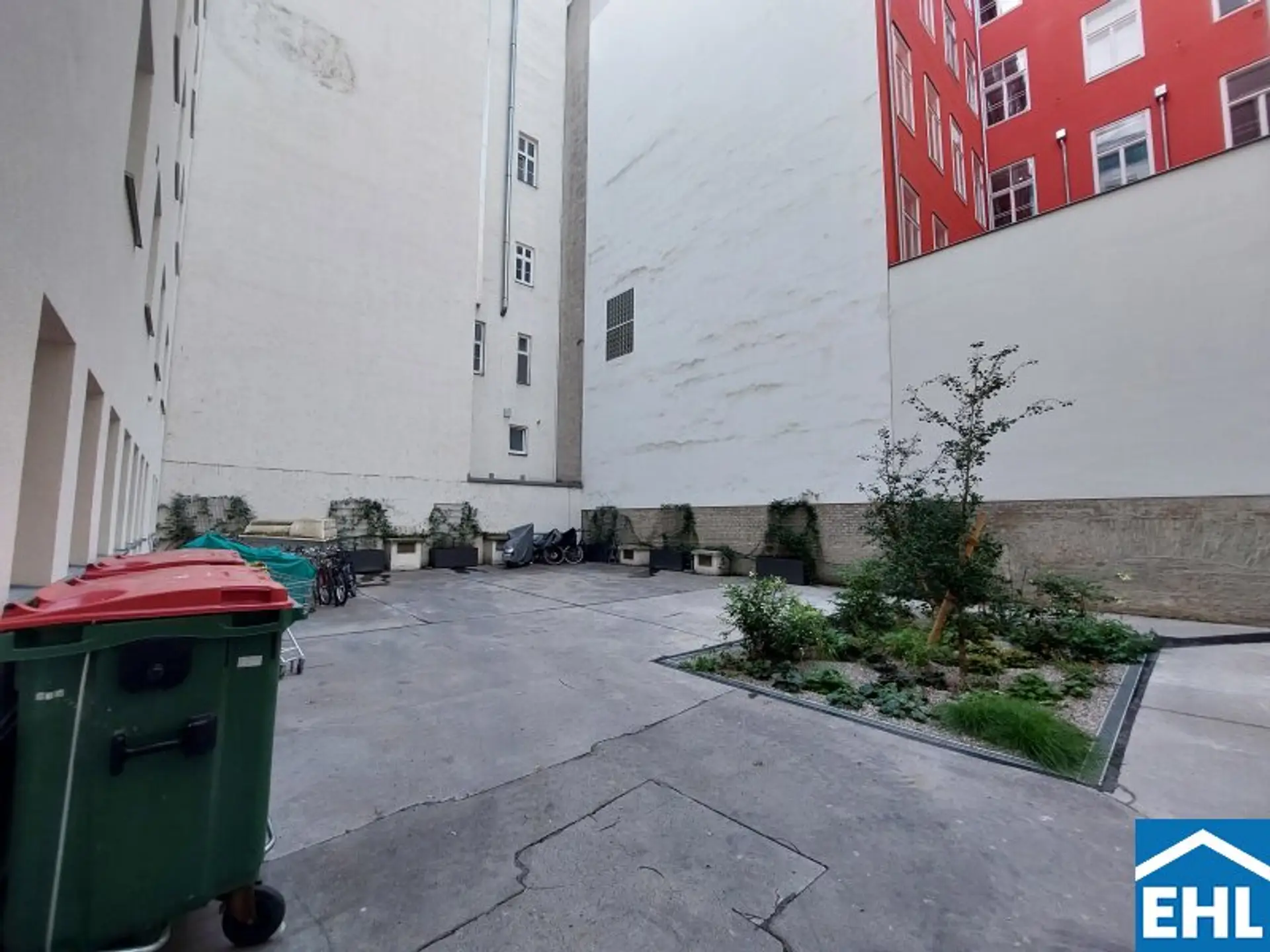 Die Wohnung selbst gliedert sich in ein großzügiges Zimmer, mit eingebauter Wohnküche (inkl. Geschirrspüler, Kühl/Gefrierkombination, Backrohr und Herd), sowie eine separate Toilette mit kleinem Waschbecken und Badezimmer mit Dusche. ACHTUNG: Kein Waschmaschinenanschluss in der Wohnung, jedoch steht eine Waschküche im Gebäude zur Verfügung. Weiters bietet das Haus einen netten Innenhof mit Fahrradständern.