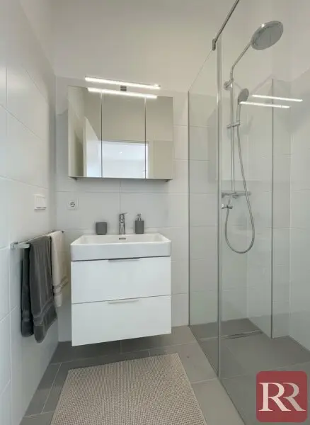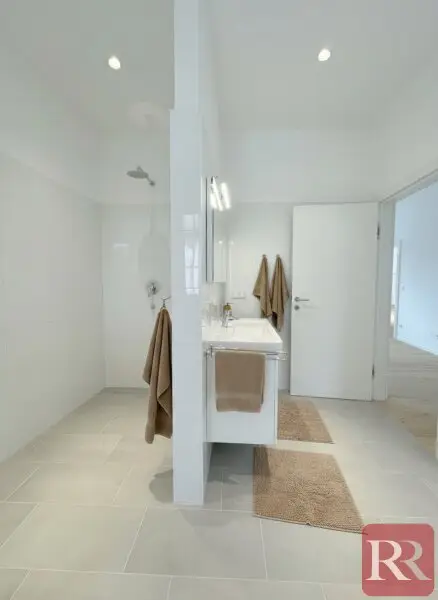 In den Wohnräumen sind hochwertige Landhausdielen aus Eiche verlegt, die eine warme und einladende Atmosphäre schaffen. Die Nassräume überzeugen mit modernen, großformatigen Fliesen sowie hochwertigen Markenprodukten, die Design und Funktionalität harmonisch verbinden.
