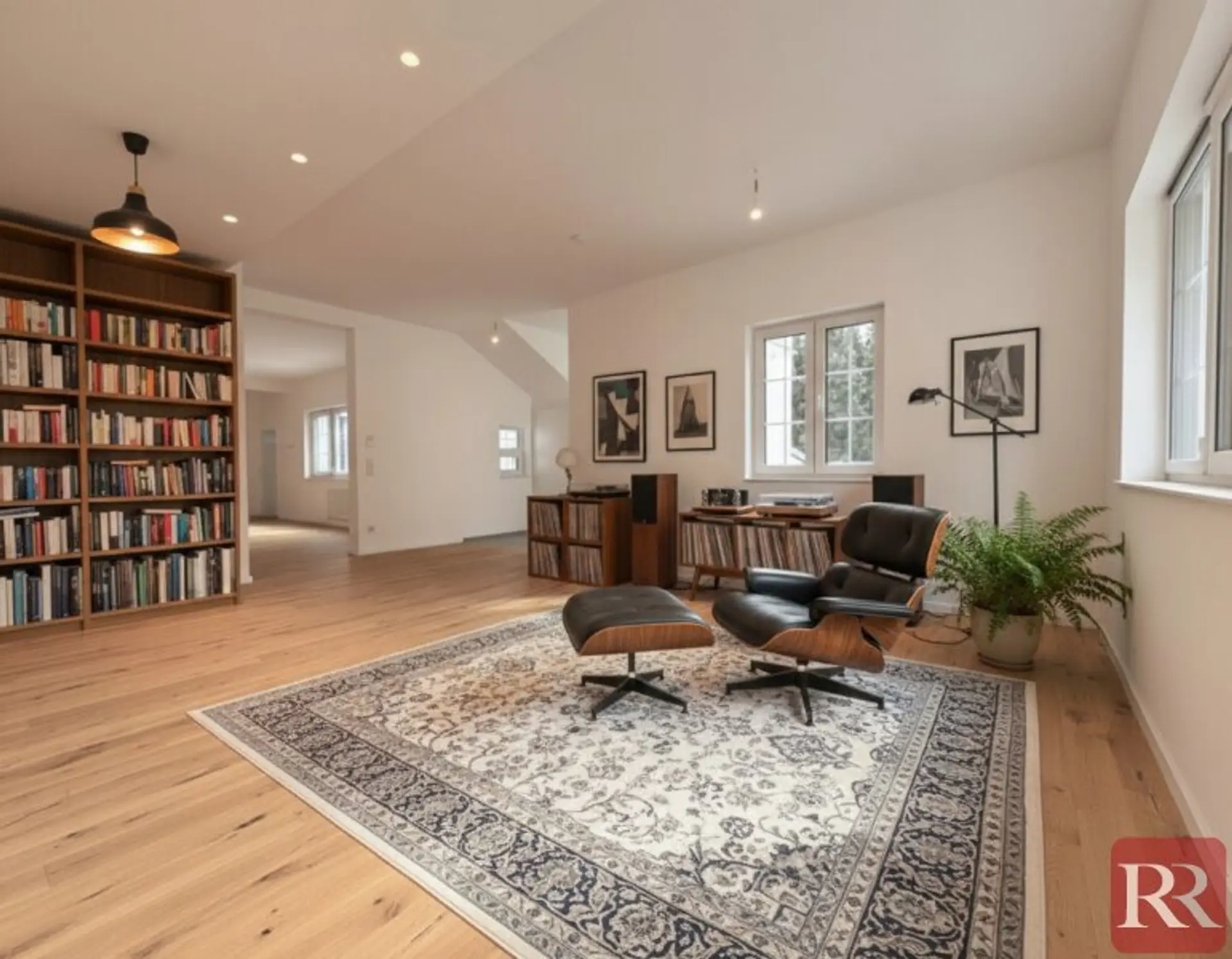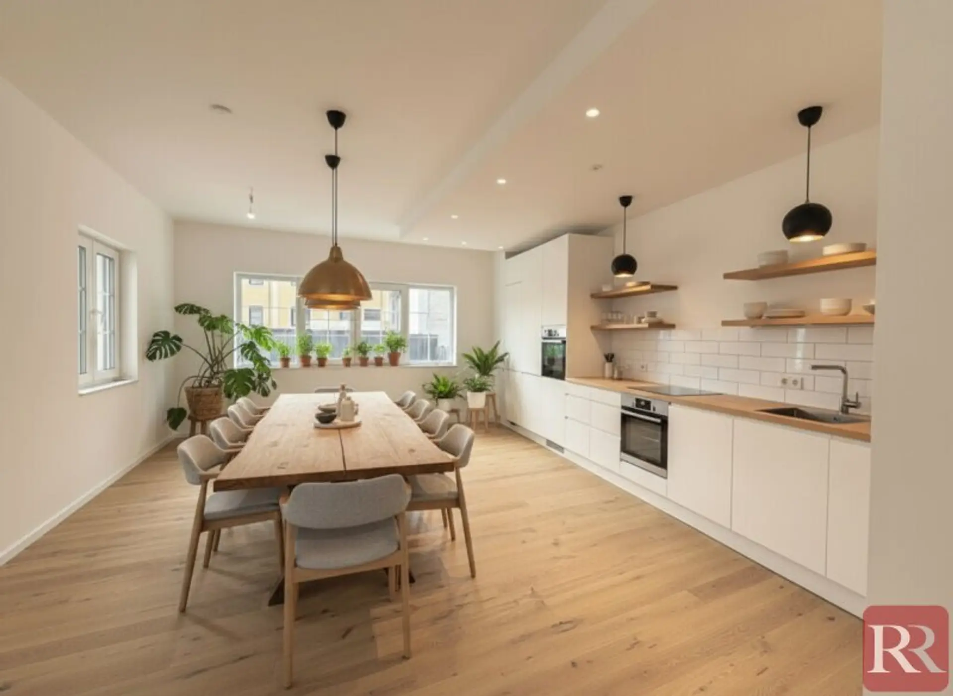 Von der Albrechtstraße aus gelangen Sie über eine separate Stiege in die im Obergeschoss gelegene Wohnung. Der einladende Vorraum führt in den großzügig gestalteten Essbereich, der nahtlos in den weitläufigen Wohnbereich übergeht und ein offenes, lichtdurchflutetes Raumgefühl vermittelt.
