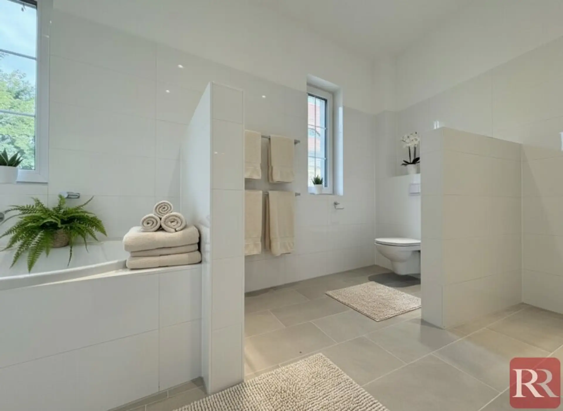 Das größte Zimmer überzeugt mit einem eleganten Bad en suite, ausgestattet mit Badewanne und Dusche. Zusätzlich sind vom Vorraum aus ein weiteres Badezimmer mit Dusche sowie eine separate Toilette bequem erreichbar.