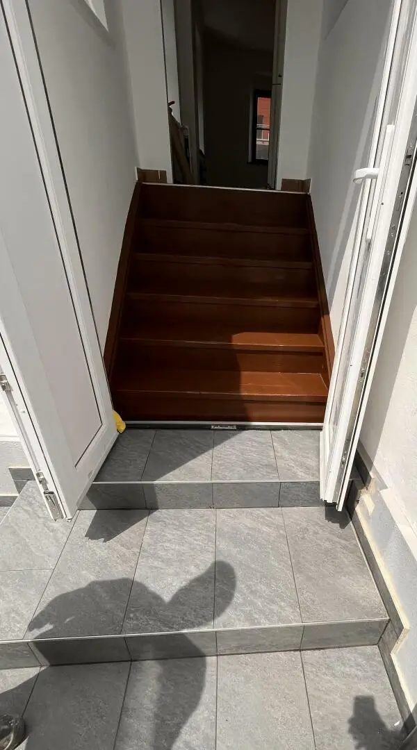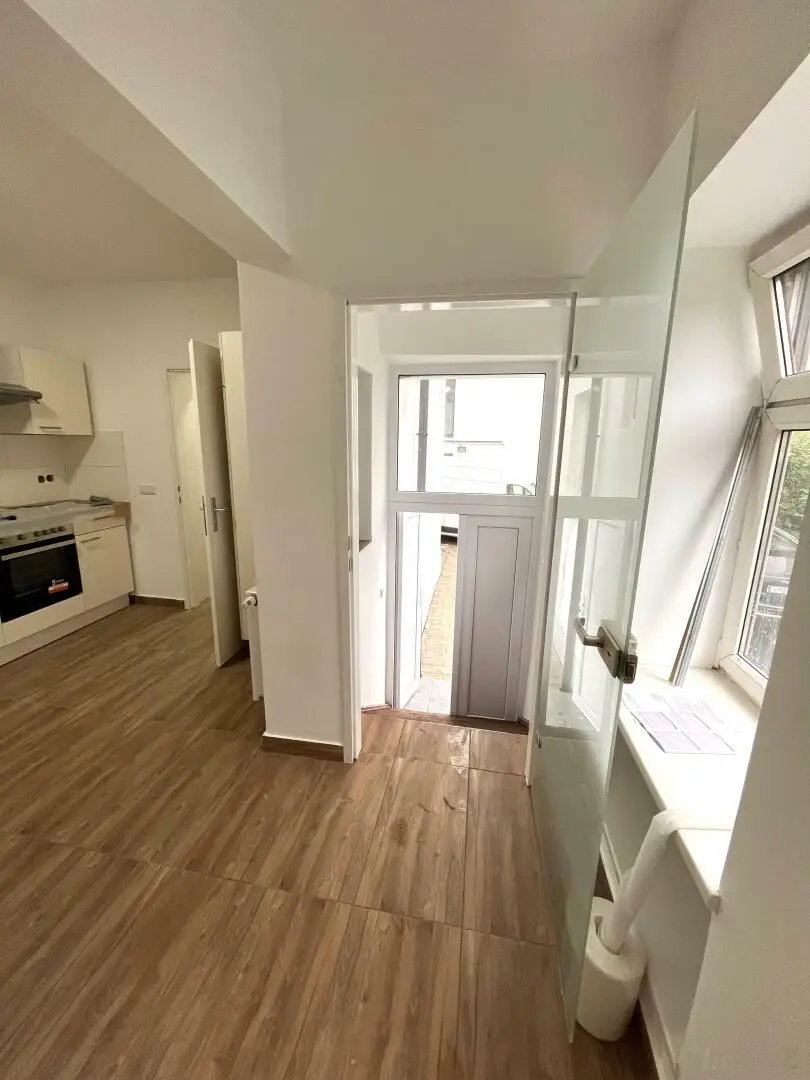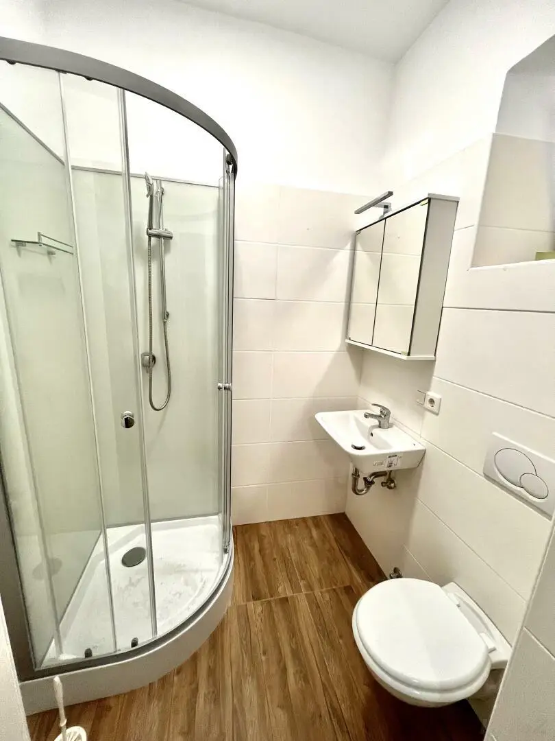 Der Eingang erfolgt über die Terrasse, Vorraum, 1 Wohnzimmer mit Küche und Zugang ins Bad/WC, Zugang zum straßenseitigen Zimmer. Die Beheizung erfolgt mit Fernwärme.