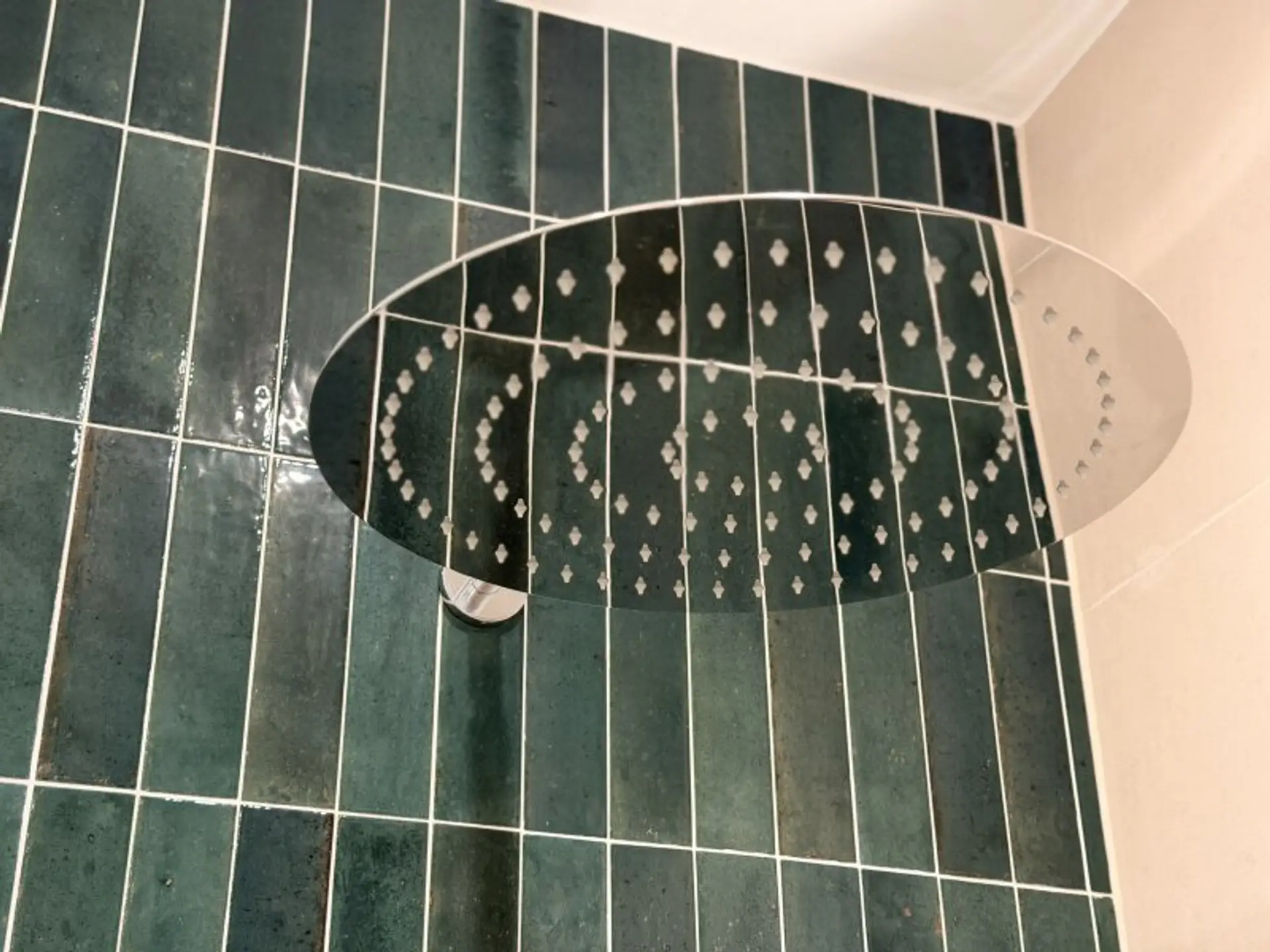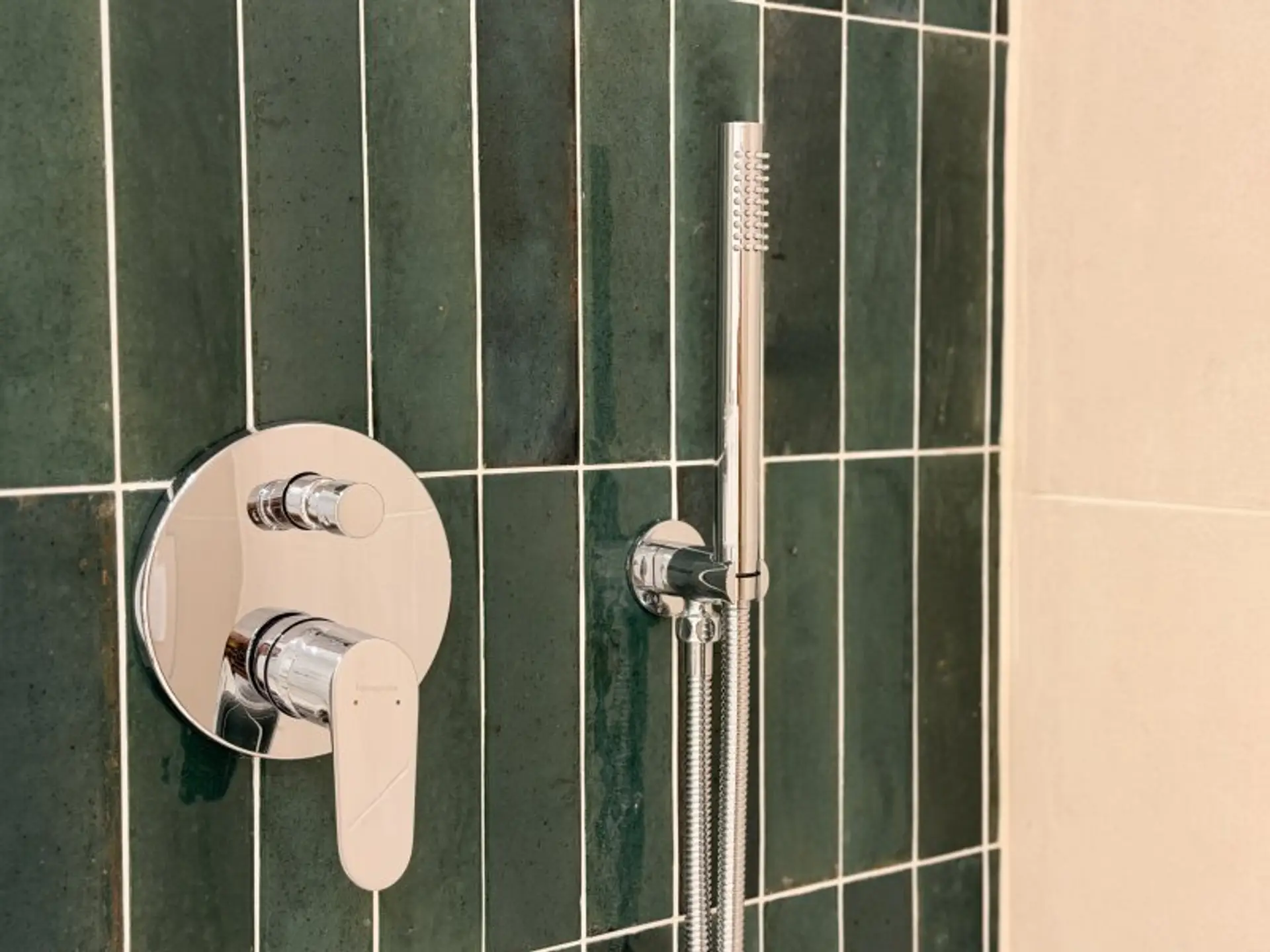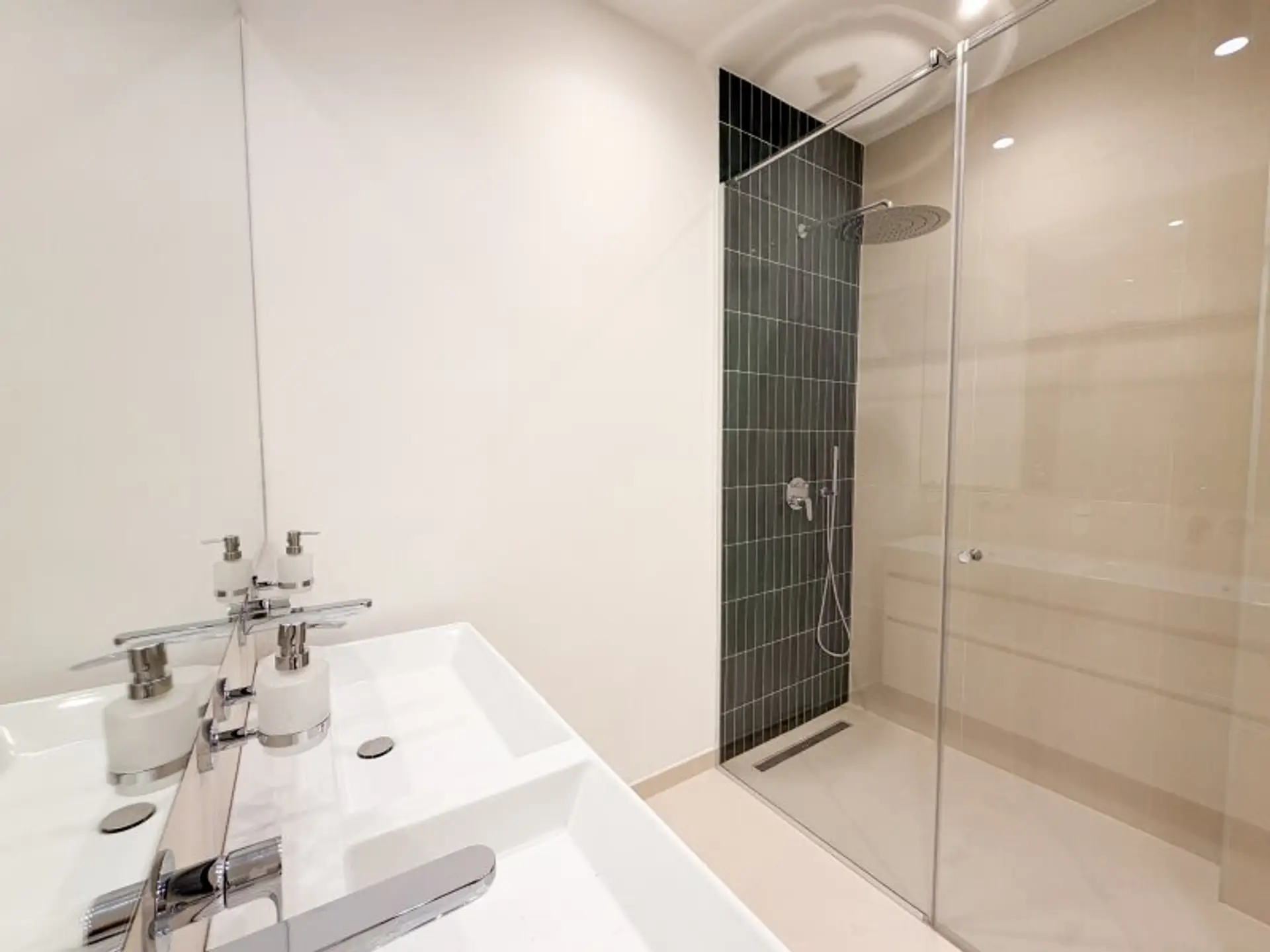 * stilvolles Highlight: edle, dunkelgrüne Fliesen als Akzentwand im Duschbereich