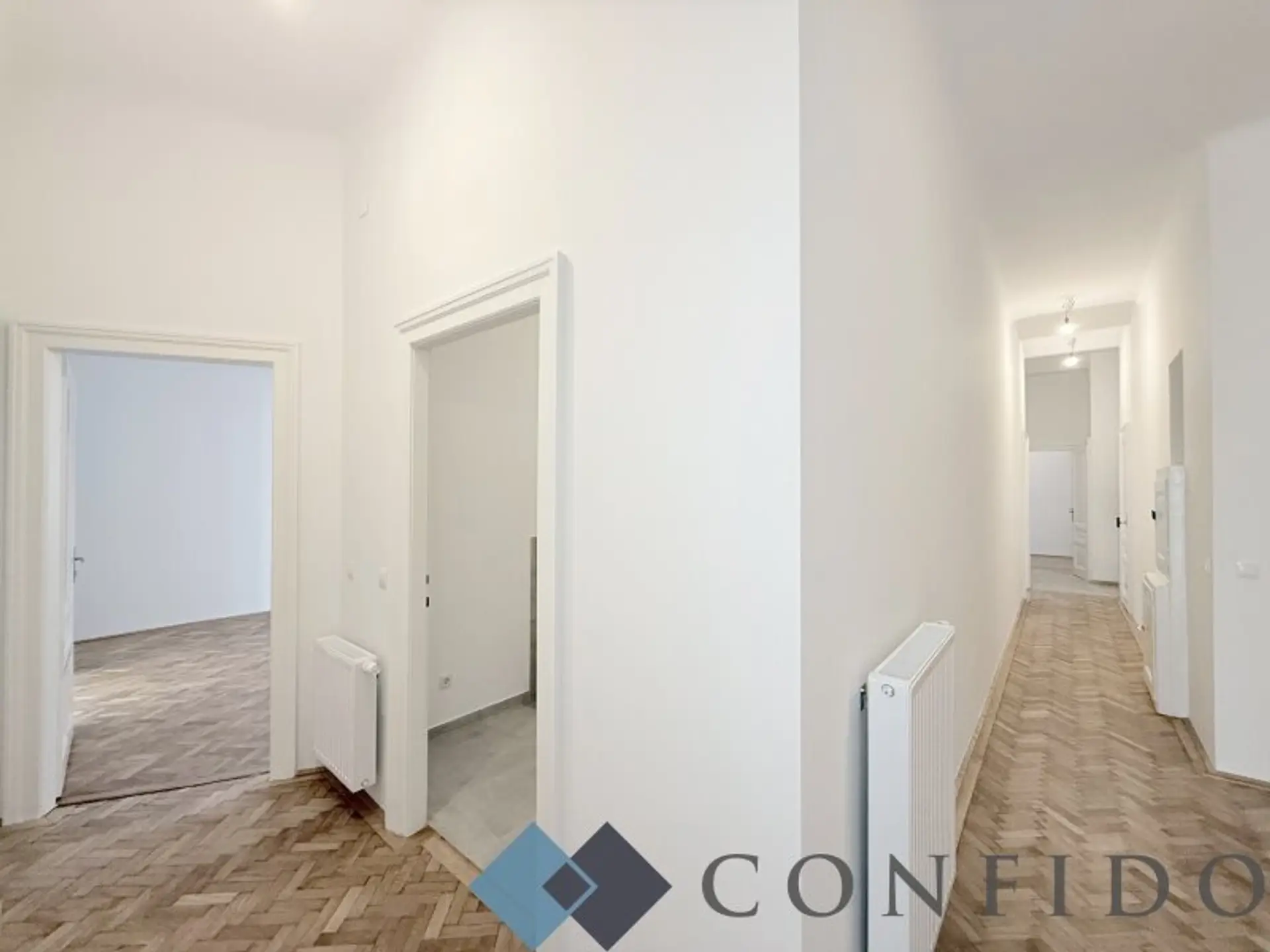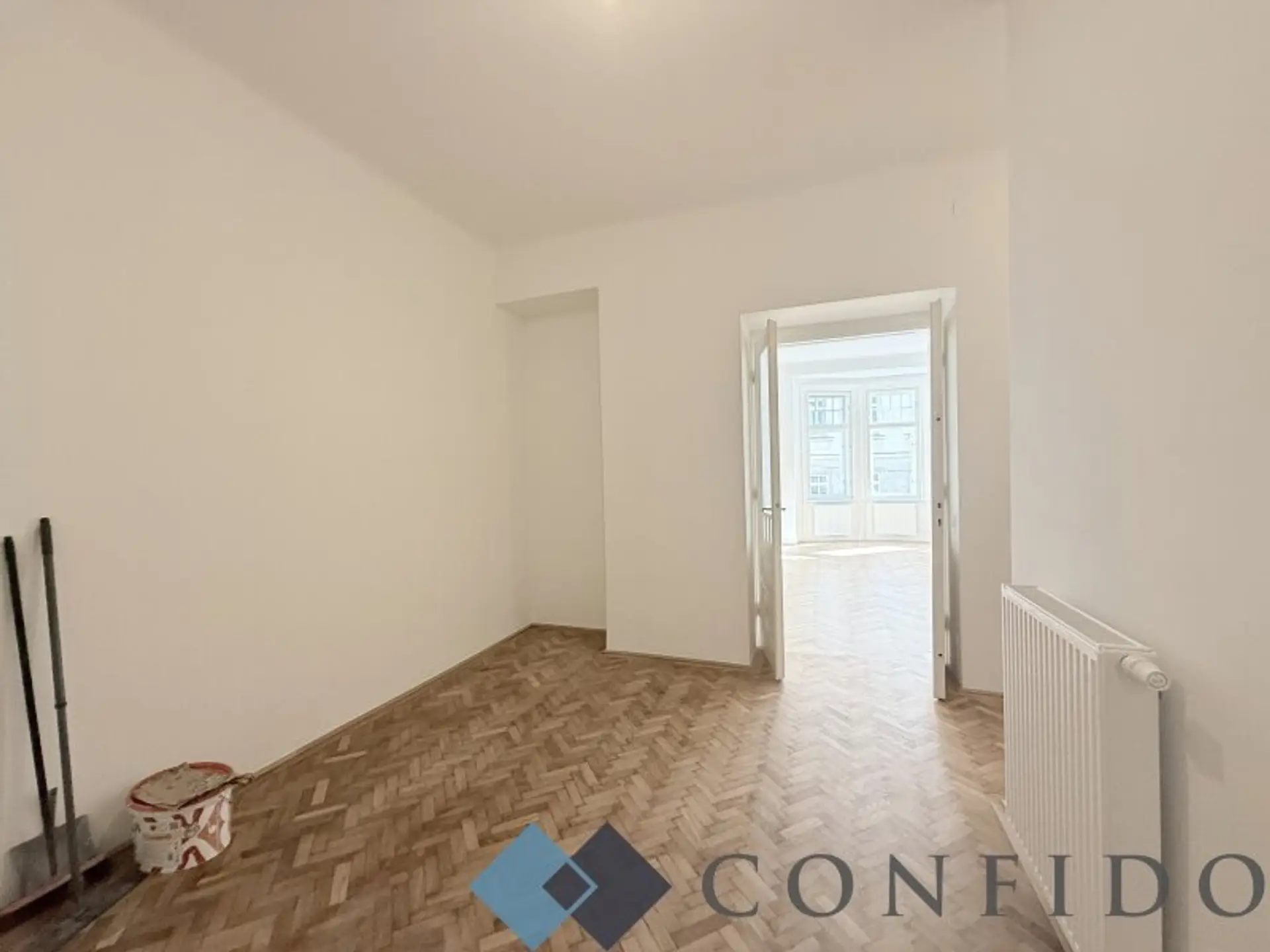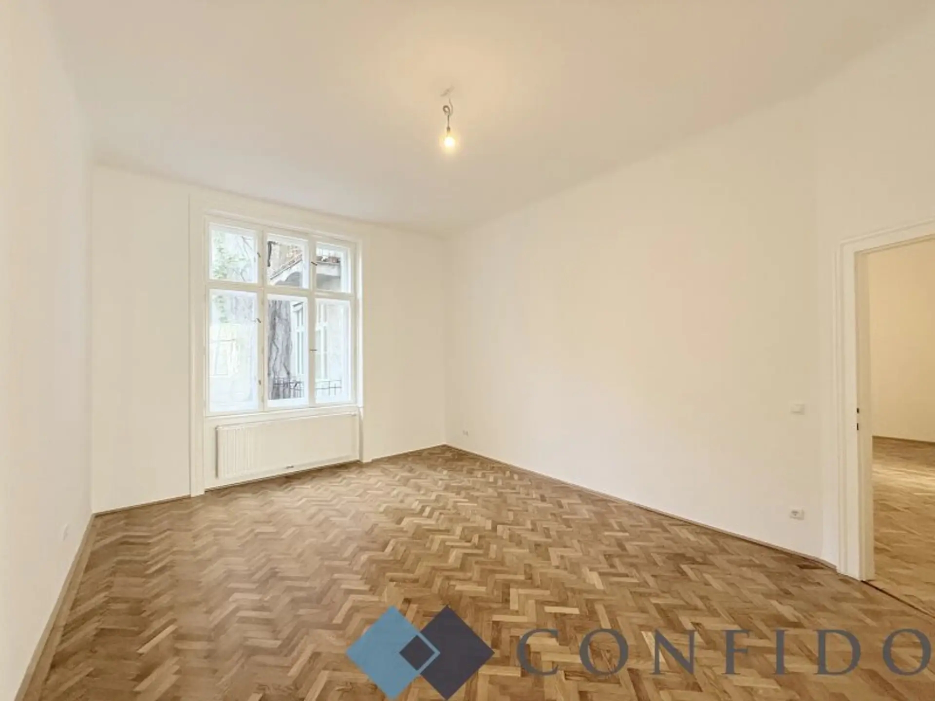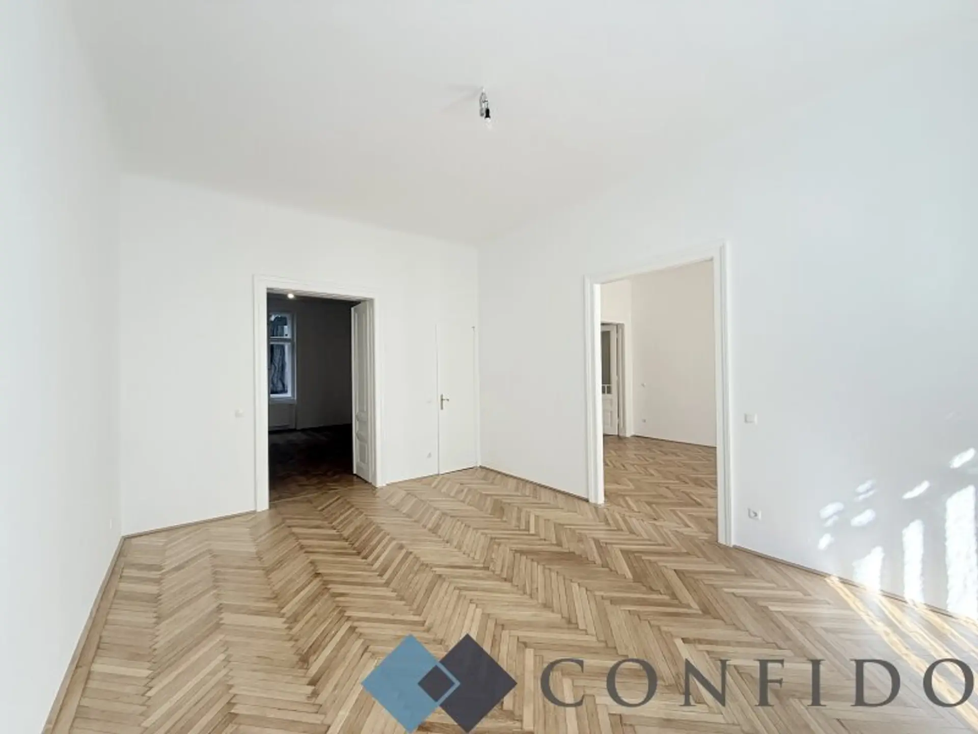 Das Eckzimmer mit Erkerfenstern bildet das Herzstück der Wohnung und eignet sich ideal als Wohn- oder Salonbereich. Die 2 angrenzenden Zimmer bieten vielseitige Nutzungsmöglichkeiten – ob als Schlafzimmer, Arbeitsraum oder Bibliothek, sie alle überzeugen durch ihre Großzügigkeit und ihren klassischen Charakter. Das geschmackvoll gestaltete Badezimmer verfügt über eine Badewanne, bodengleiche Dusche, ein Doppelwaschbecken.