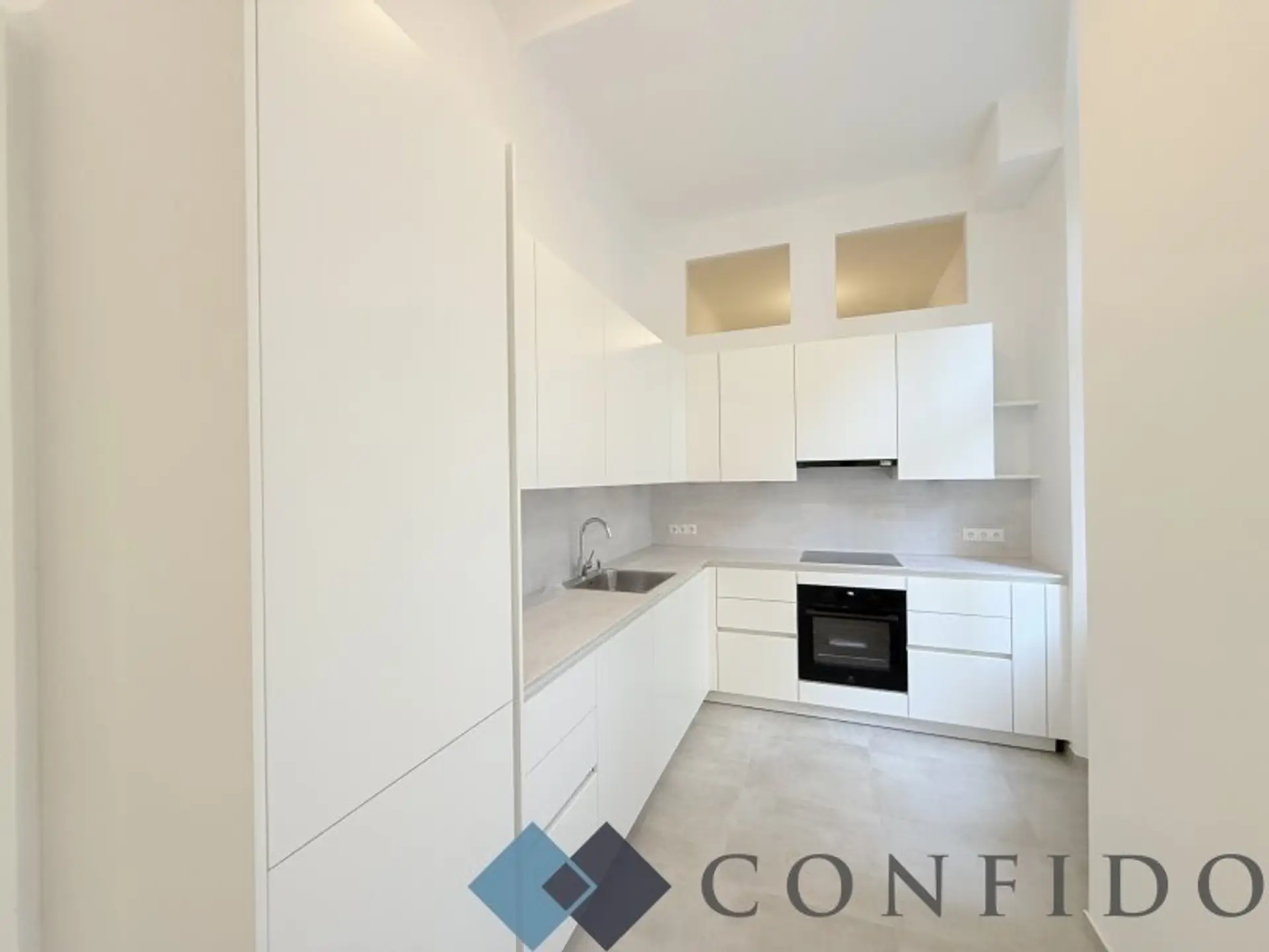 Die moderne und ausgestattete Küche lässt keine Wünsche offen. Sie ist großzügig geschnitten, mit hochwertigen Geräten ausgestattet und bietet direkten Zugang zum Balkon, der einen Blick in den ruhigen Innenhof ermöglicht. Ein kleiner Kabinettraum bietet zusätzlichen Platz für ein Homeoffice oder eine Garderobe..