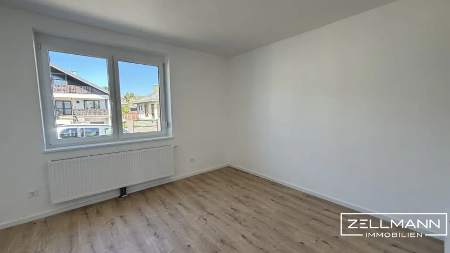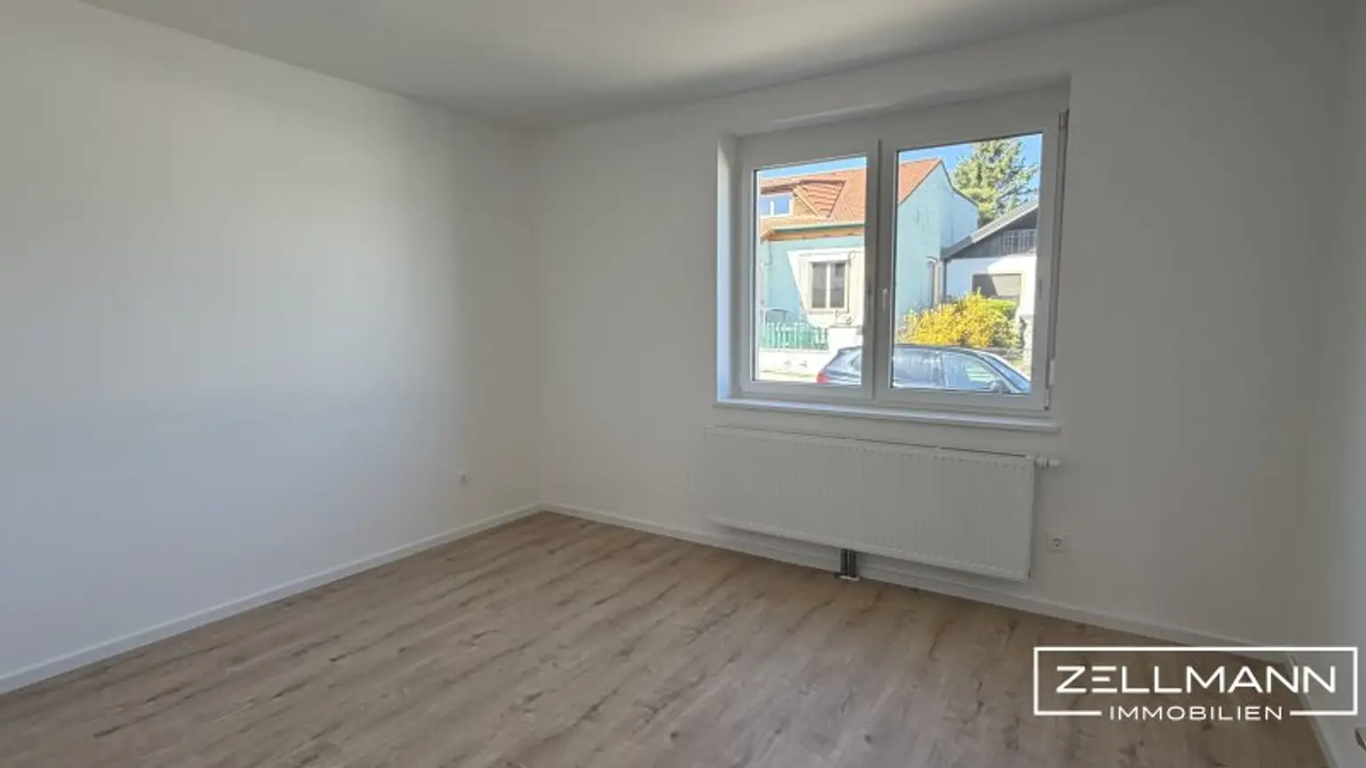 Die Kombination aus warmem Boden und schlichten, weißen Wänden sorgt für ein zeitloses Wohngefühl – modern, ruhig und hochwertig.
