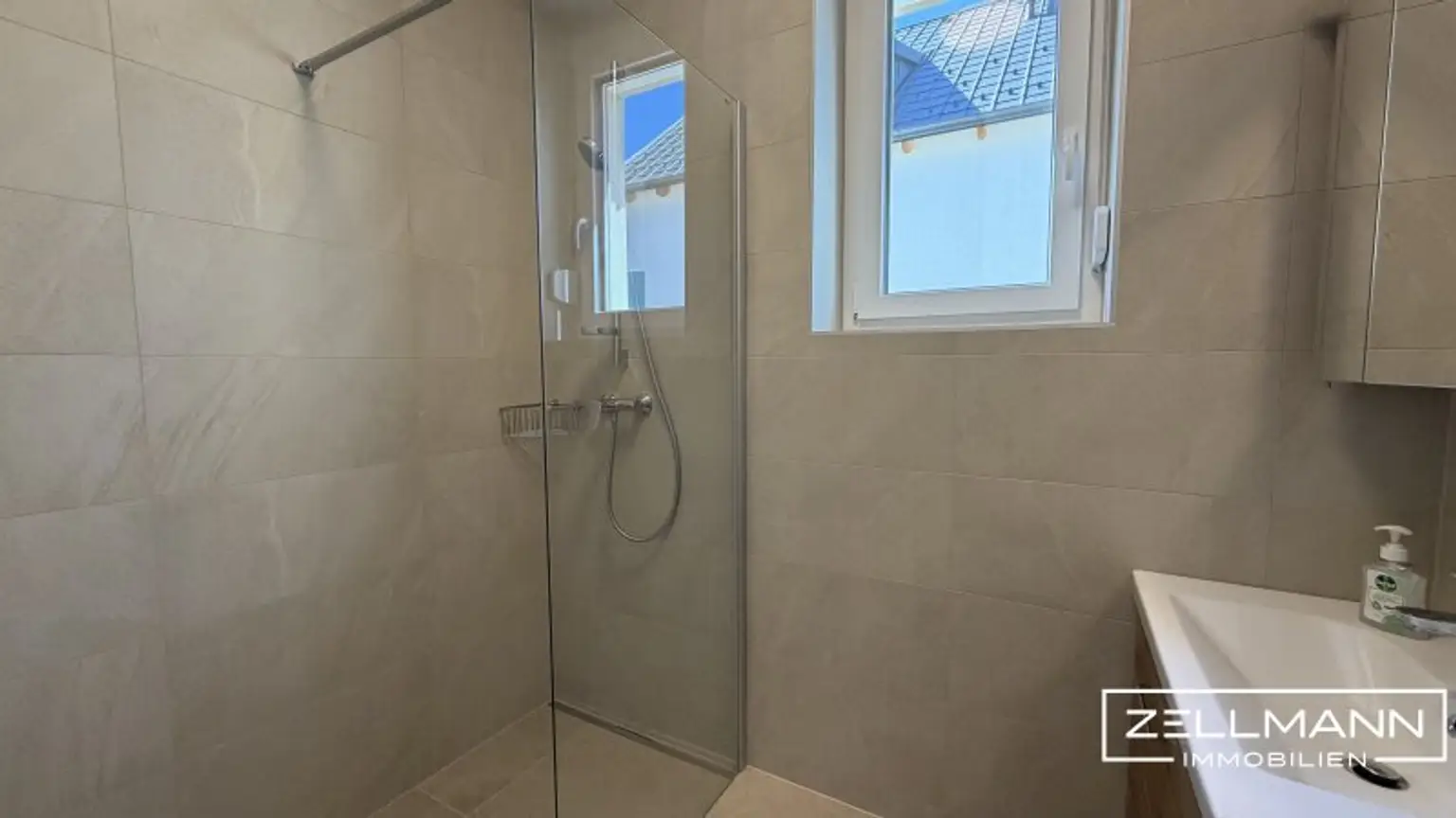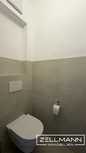 Großformatige Fliesen, eine elegante Walk-In-Dusche sowie hochwertige Armaturen schaffen ein stilvolles Ambiente. Das separate WC wurde ebenso neu ausgeführt und fügt sich harmonisch in das Gesamtbild ein.