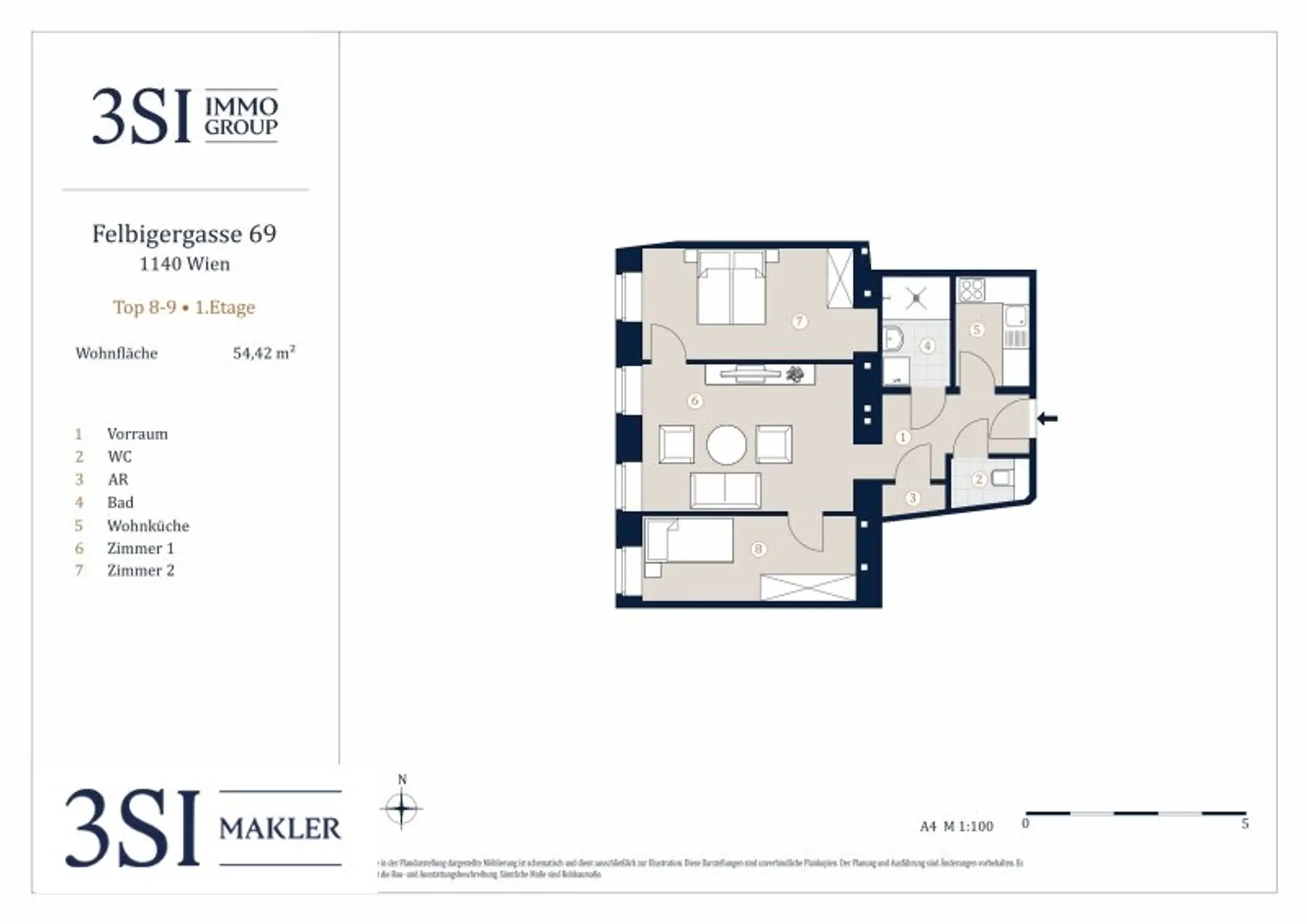 Die durchdachte Raumaufteilung umfasst einen Vorraum, eine großzügige Wohnküche, zwei Zimmer, ein modernes Badezimmer, ein separates WC sowie einen Abstellraum und bietet ein zeitgemäßes Wohnkonzept für anspruchsvolle Käufer.