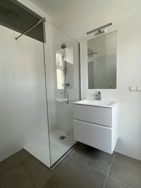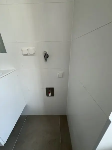 geschmackvoll verfliestes Duschbad mit Waschtisch und WA-Anschluss