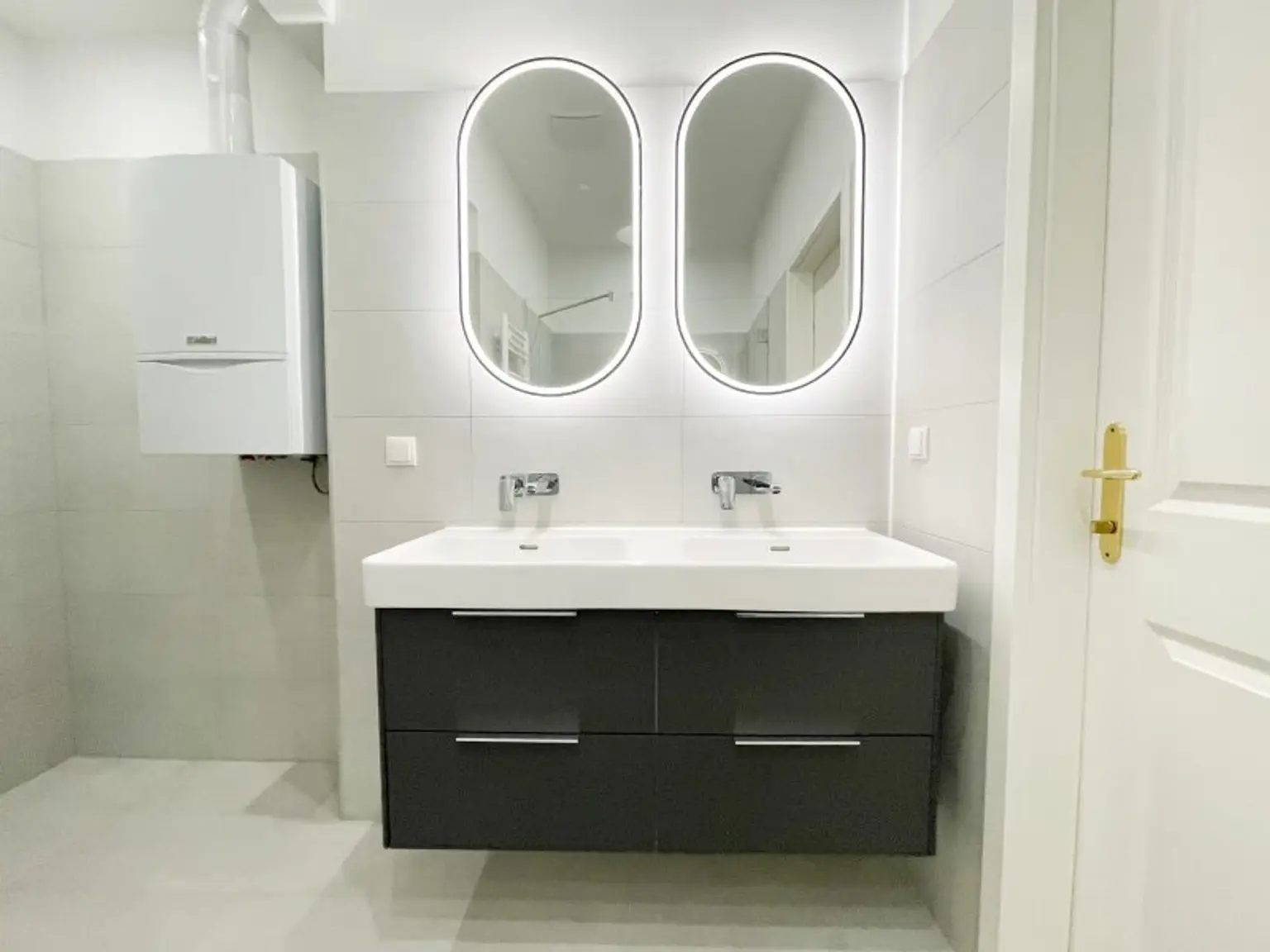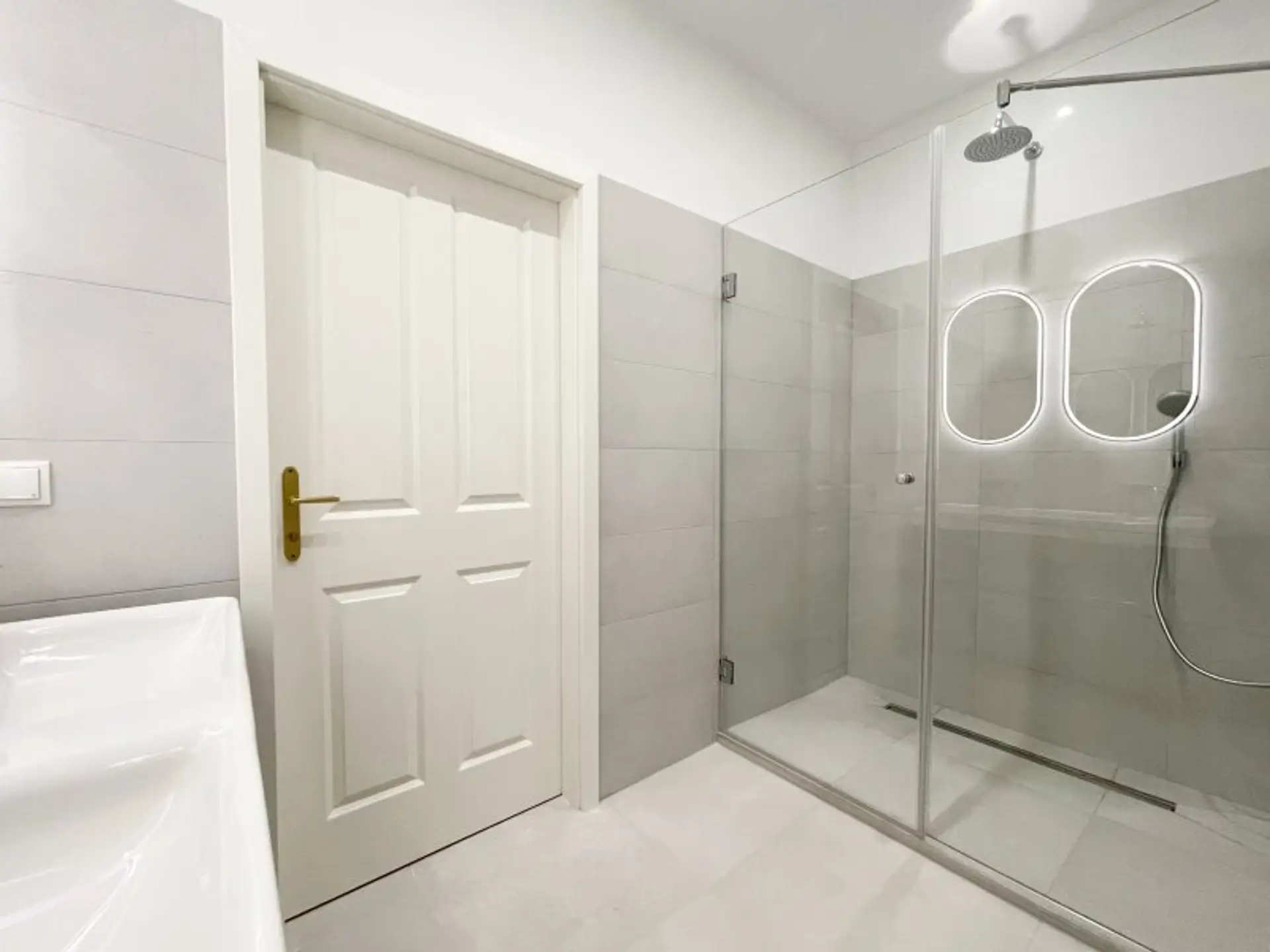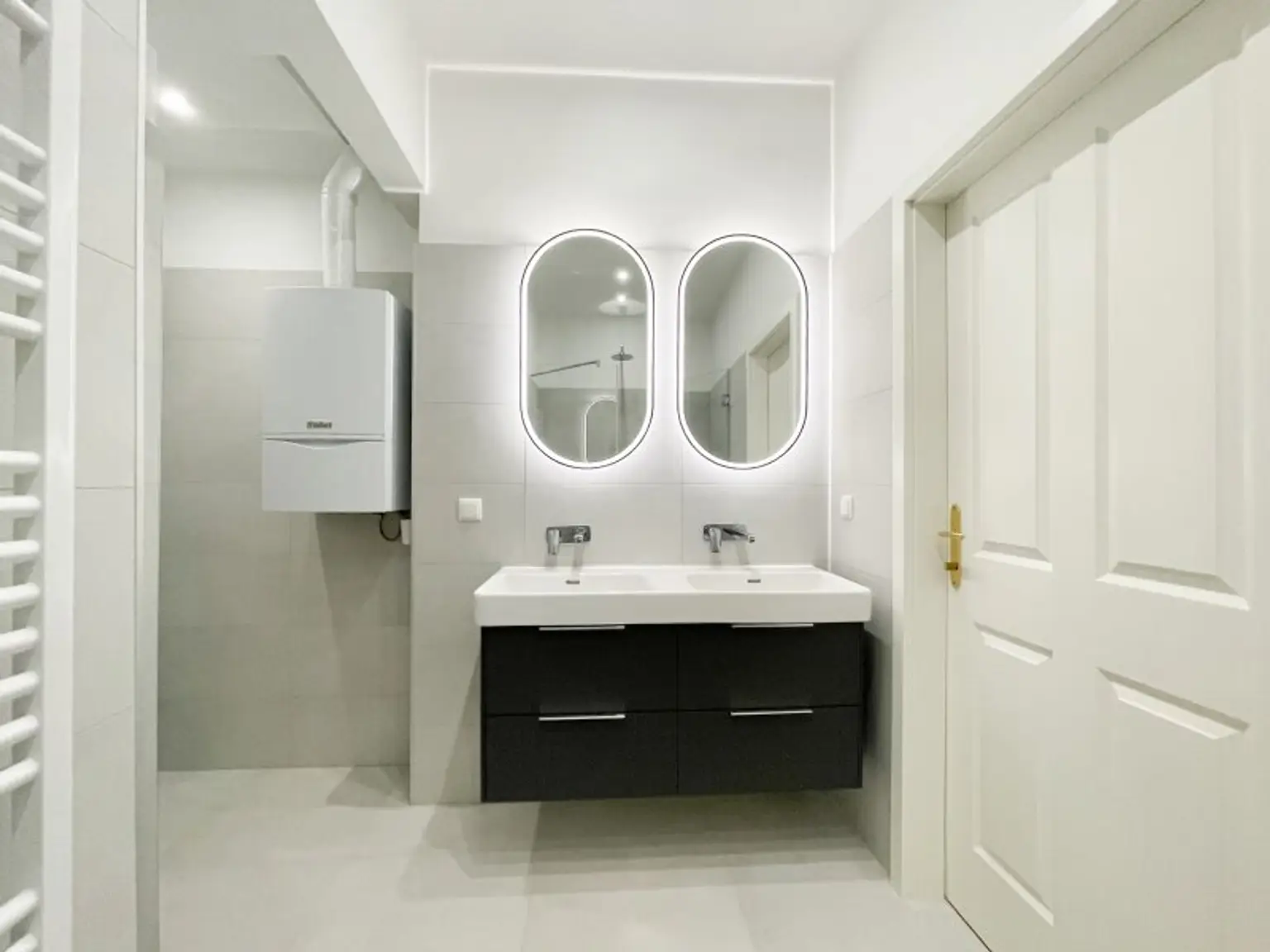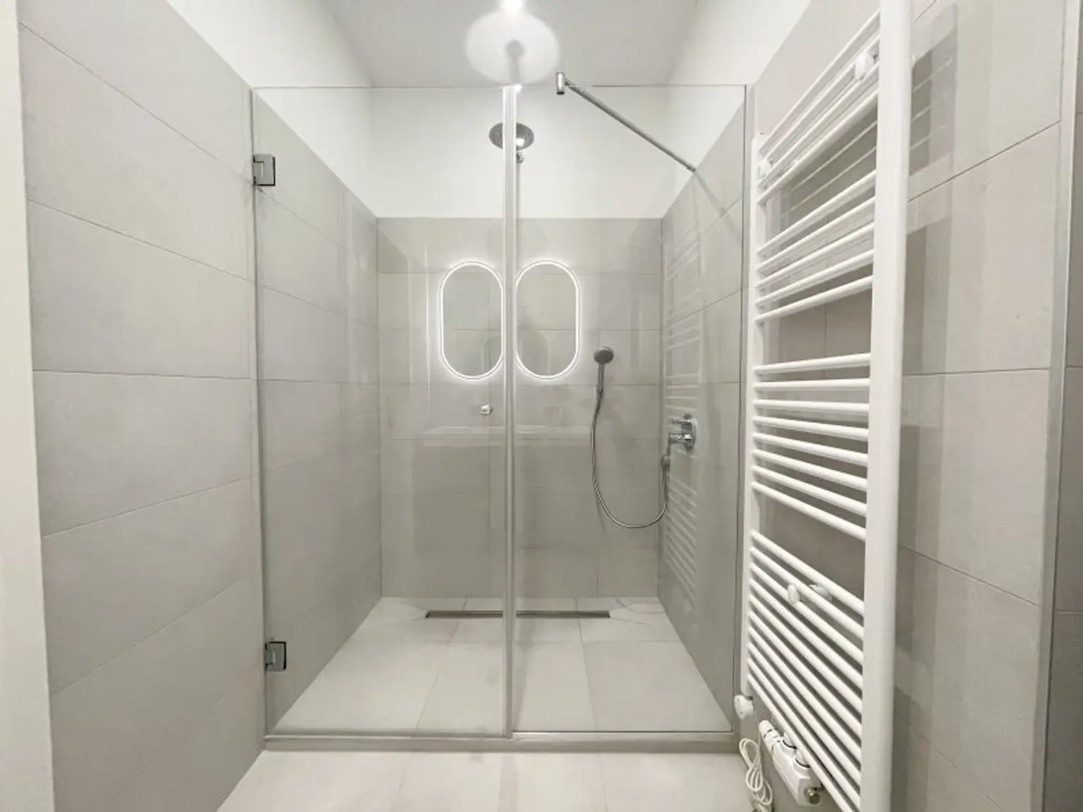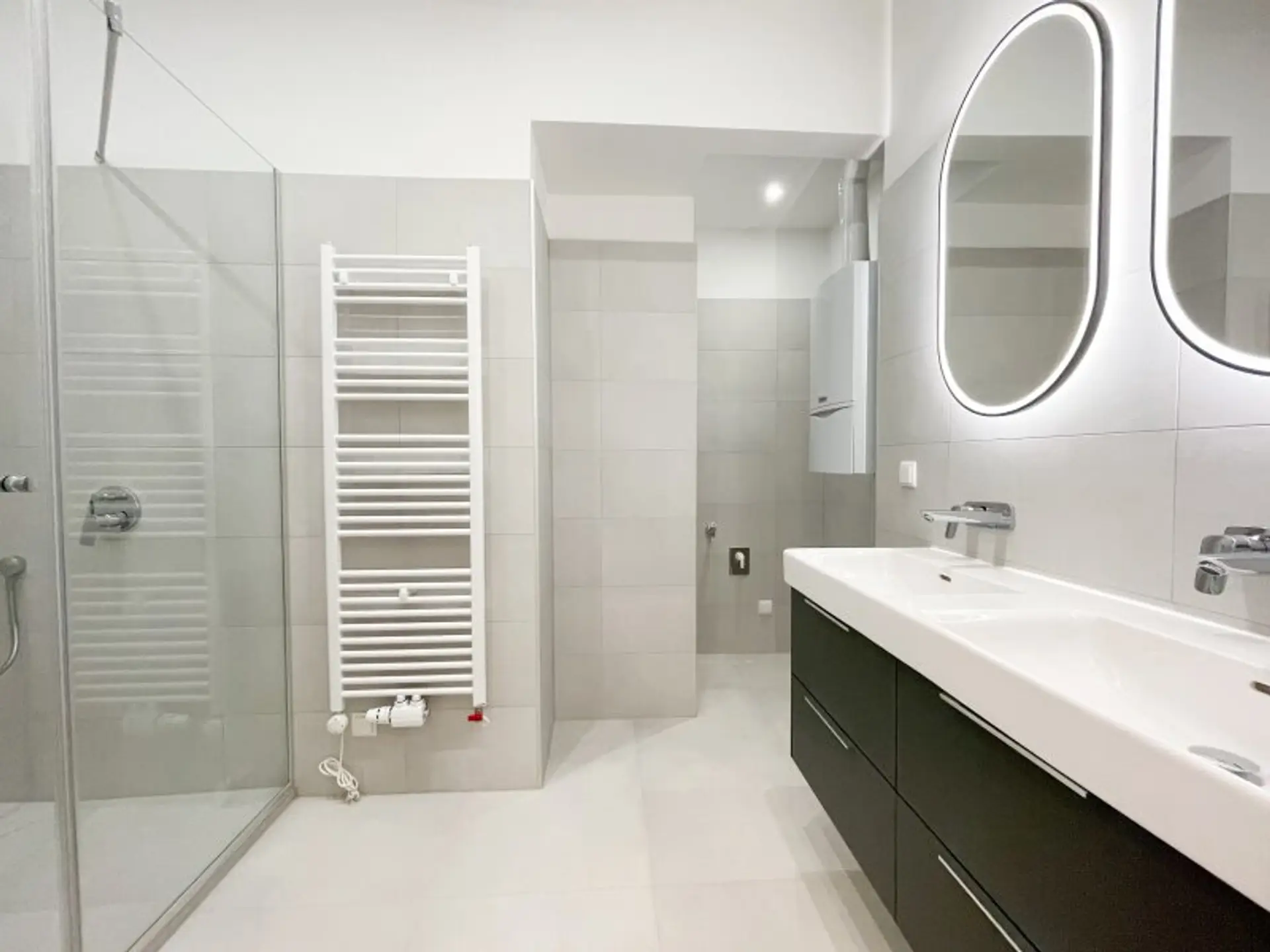 hochwertig saniertes Bad mit großer Walk-In-Dusche, Waschmaschinenanschluss, Gastherme & Doppelwaschbecken