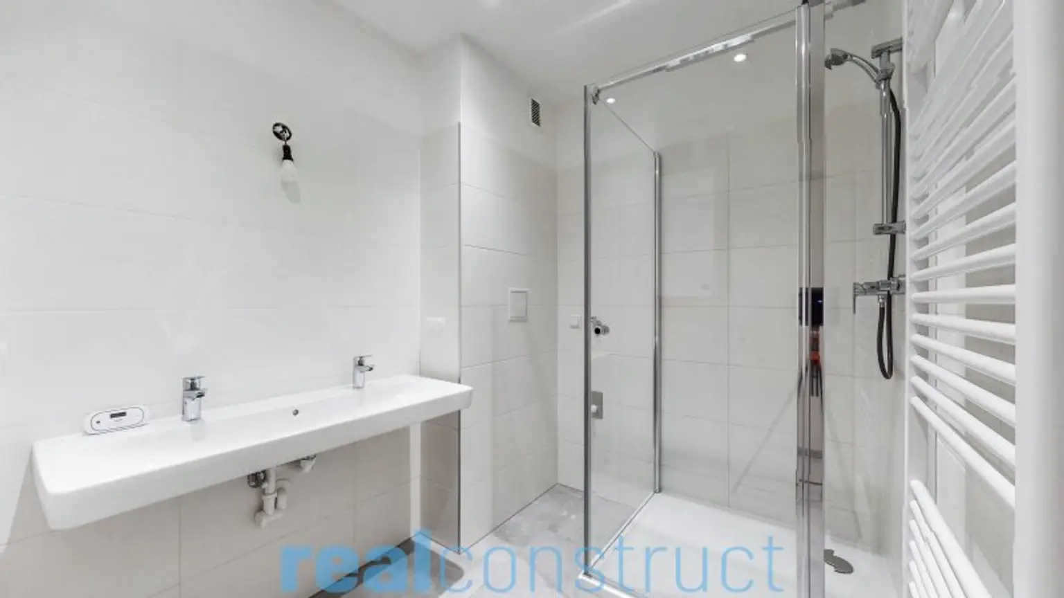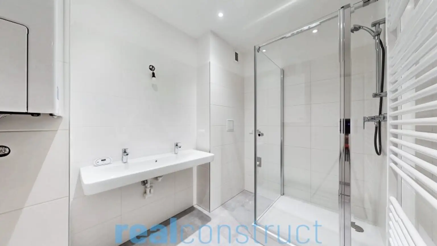 modern verfliestes Badezimmer mit Dusche, Waschtisch, Handtuchheizkörper und Waschmaschinenanschluss