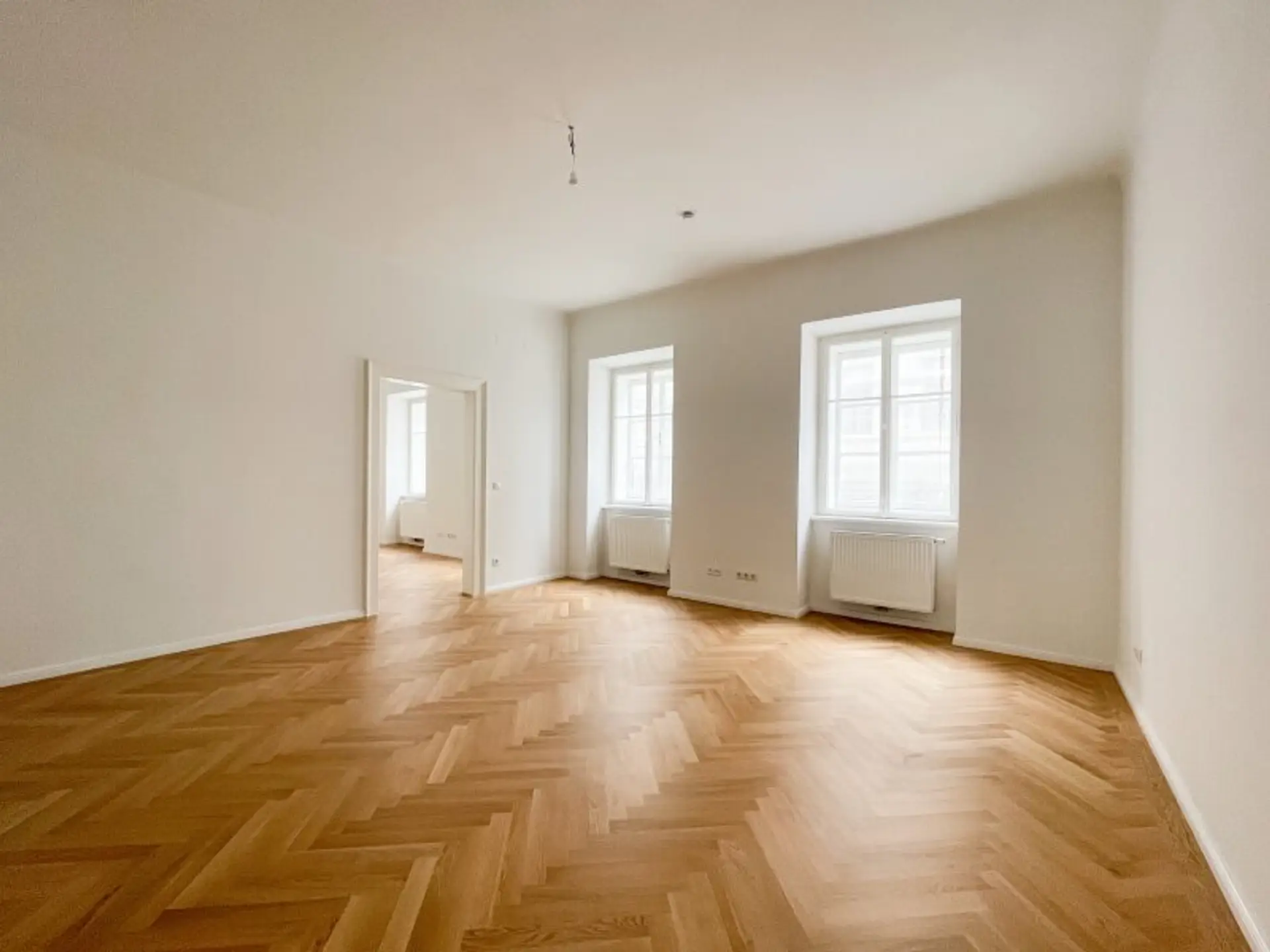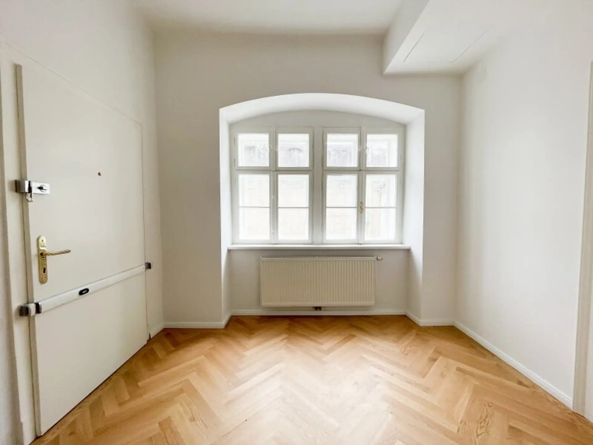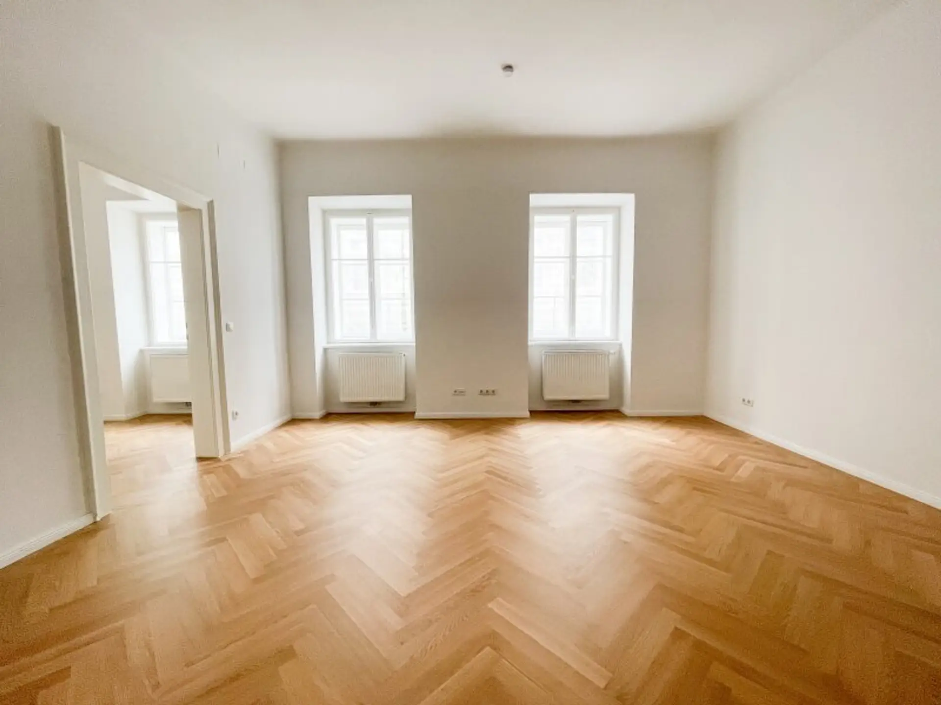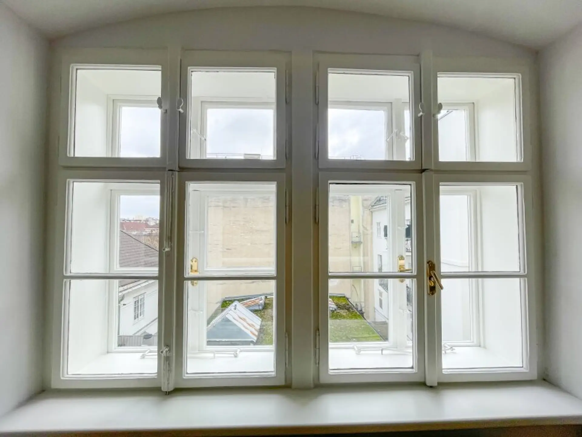 Die Wohnung bietet drei vollwertig nutzbare Zimmer, zwei Schlafzimmer (hofseitig & zur Thurngasse) sowie ein quadratisches Wohnzimmer mit ca. 25,19 m². Die Raumhöhe von ca. 3,12 m in den Aufenthaltsräumen verleiht ein außergewöhnliches Altbau-Raumgefühl.