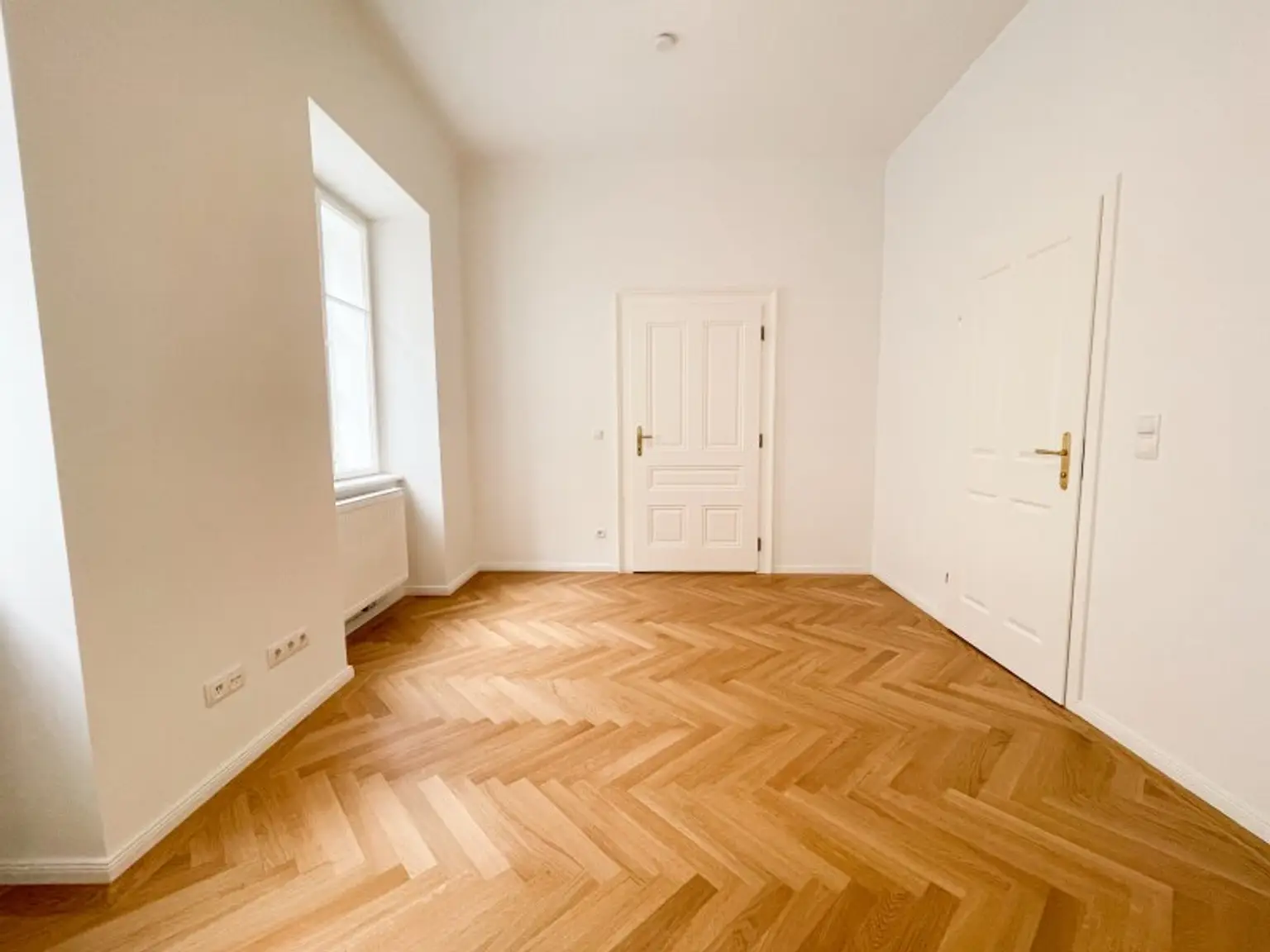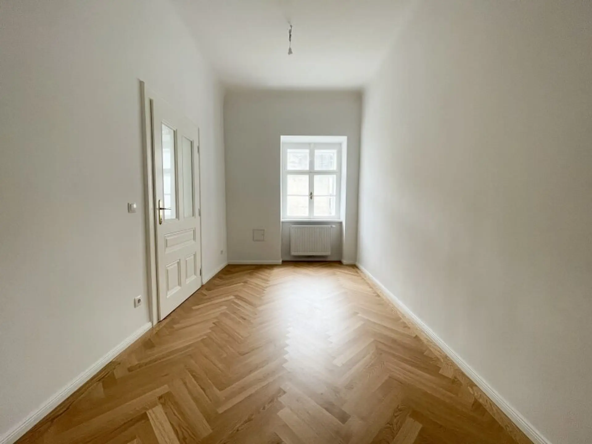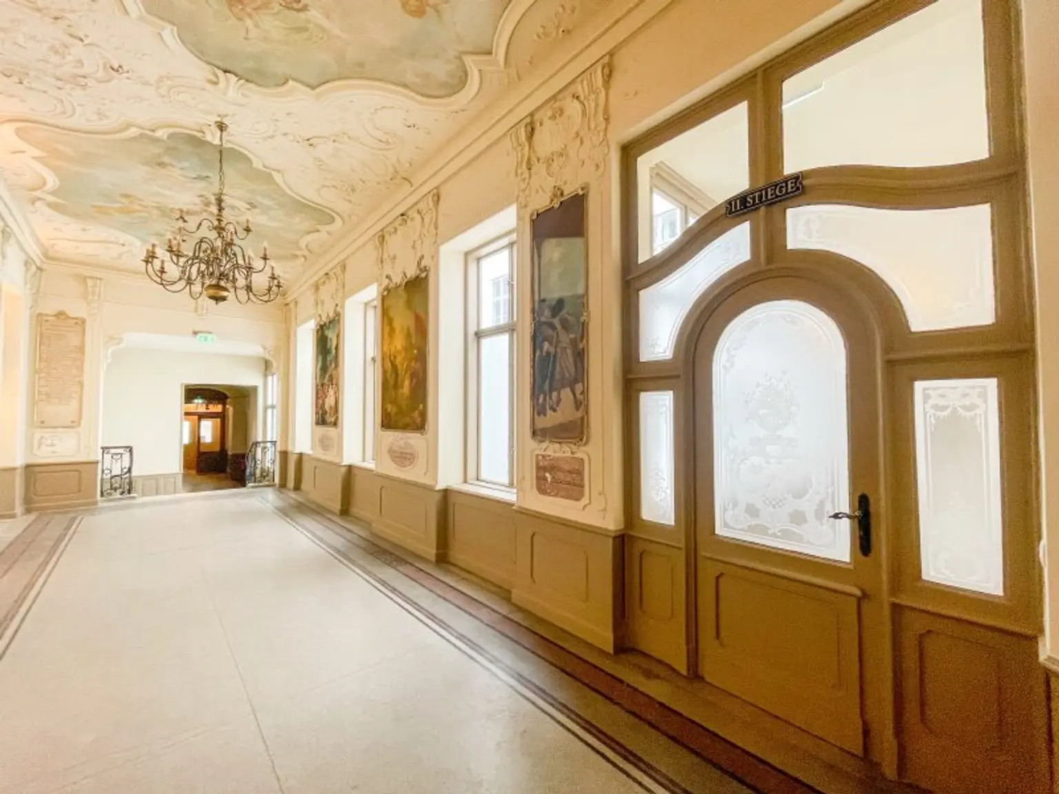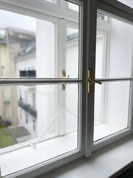 Die Wohnung bietet drei vollwertig nutzbare Zimmer, zwei Schlafzimmer (hofseitig & zur Thurngasse) sowie ein quadratisches Wohnzimmer mit ca. 25,19 m². Die Raumhöhe von ca. 3,12 m in den Aufenthaltsräumen verleiht ein außergewöhnliches Altbau-Raumgefühl.