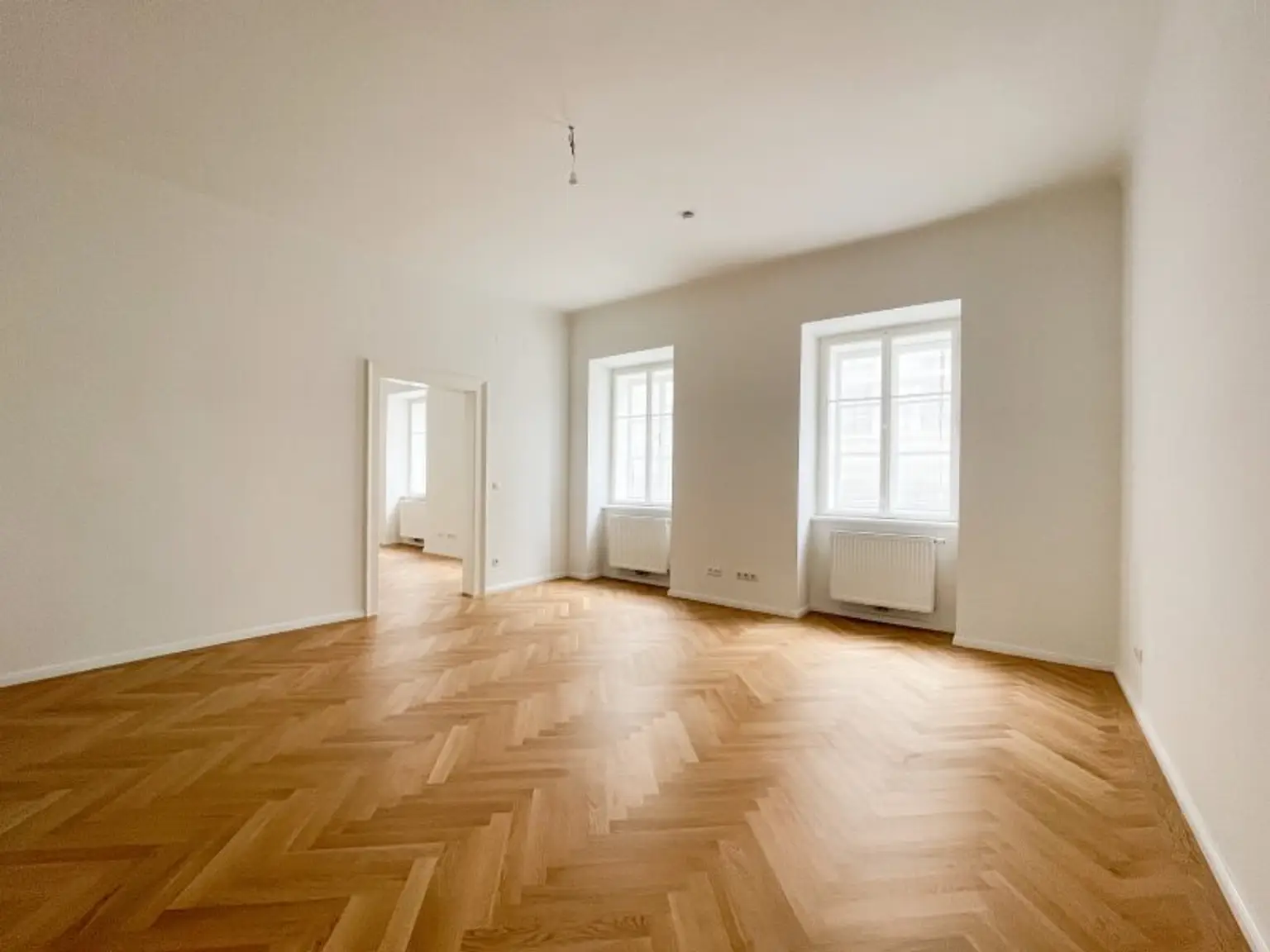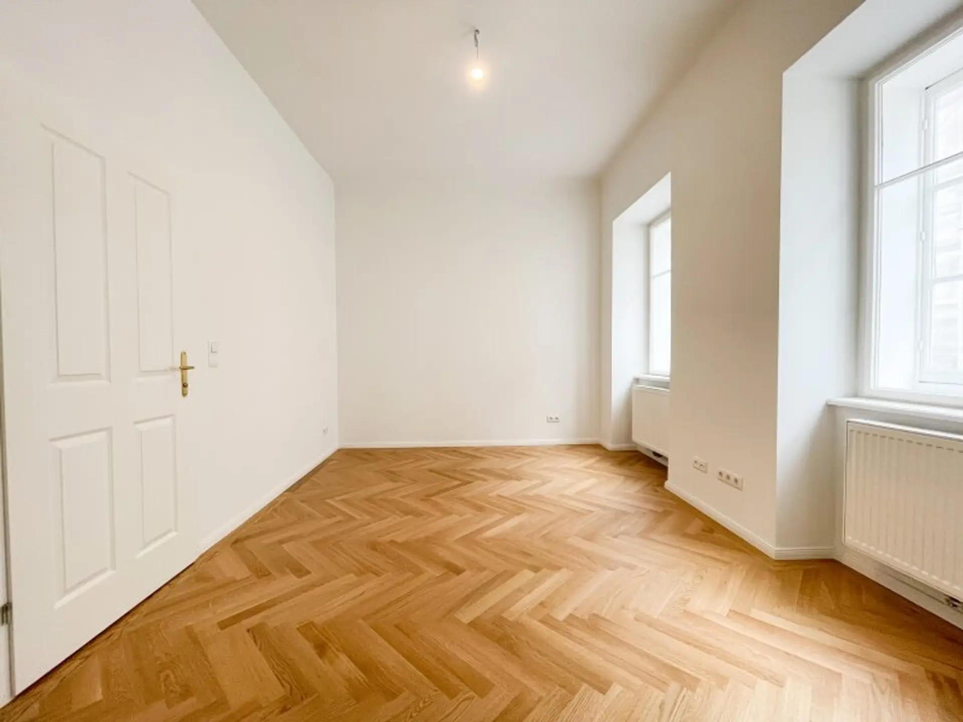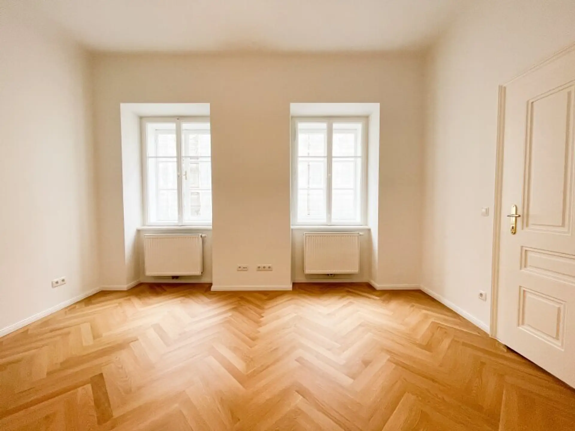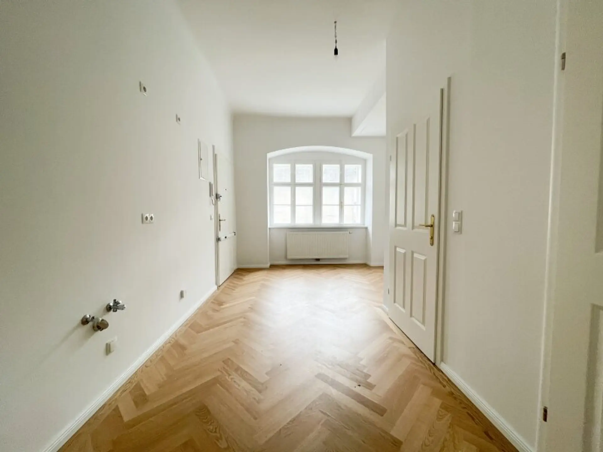 Die Wohnung bietet drei vollwertig nutzbare Zimmer, zwei Schlafzimmer (hofseitig & zur Thurngasse) sowie ein quadratisches Wohnzimmer mit ca. 25,19 m². Die Raumhöhe von ca. 3,12 m in den Aufenthaltsräumen verleiht ein außergewöhnliches Altbau-Raumgefühl.