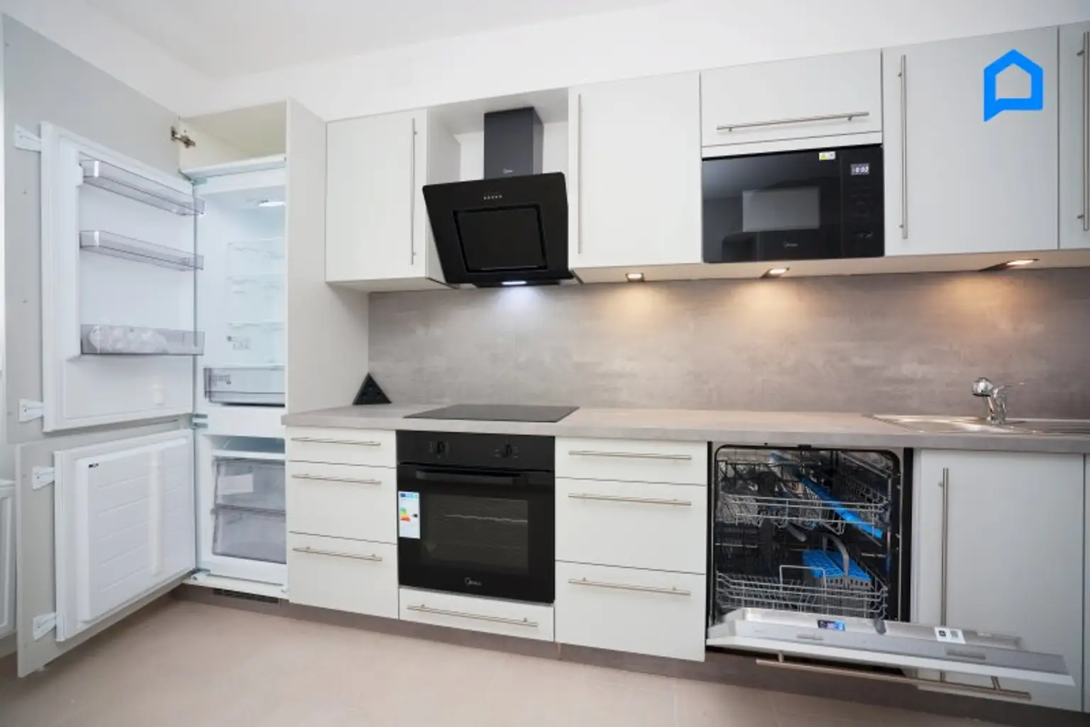 Separate großzügige Markenküche mit Backrohr, Mikrowelle, Kühlschrank, Gefrierschrank, Dunstabzug sowie viel Arbeitsfläche und Stauraum.