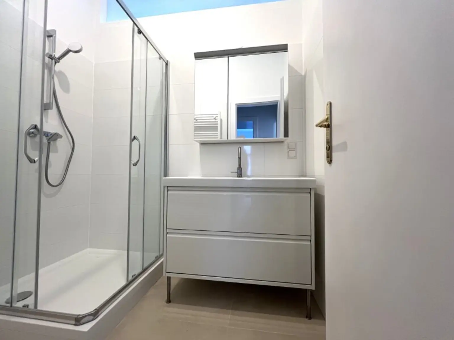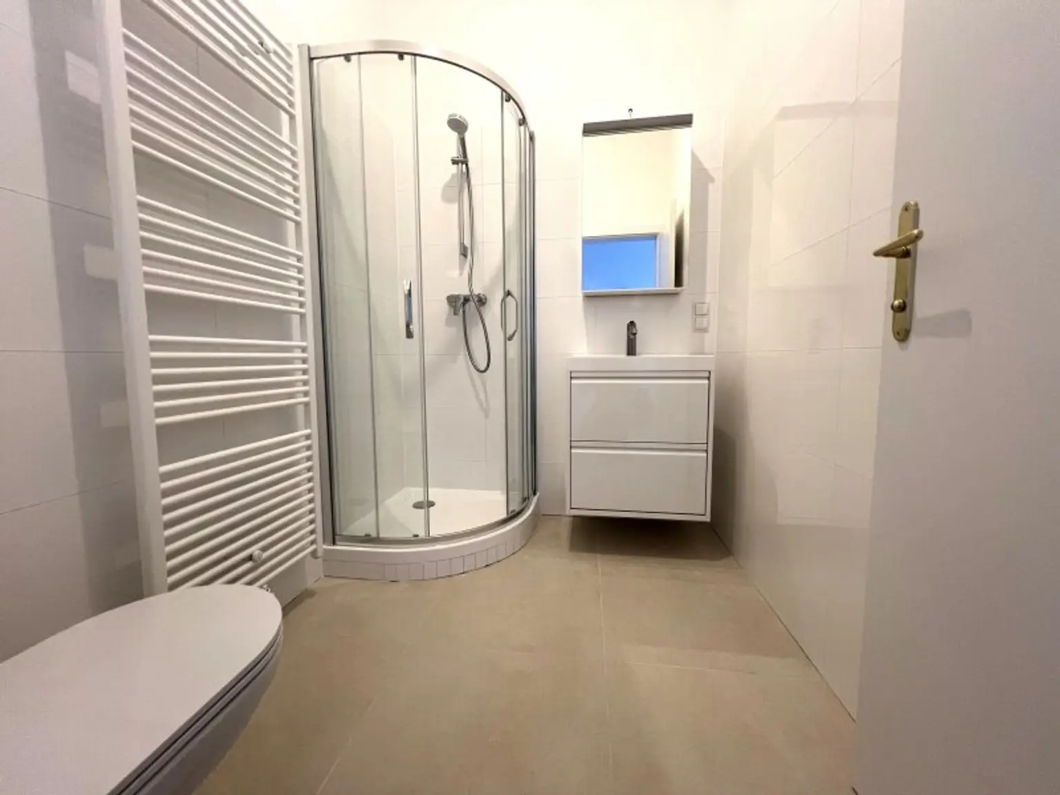 - erstes Badezimmer mit Dusche, Bademöbelset - Waschbecken mit Unterschrank und beleuchtetem Spiegelschrank, Oberlichte
