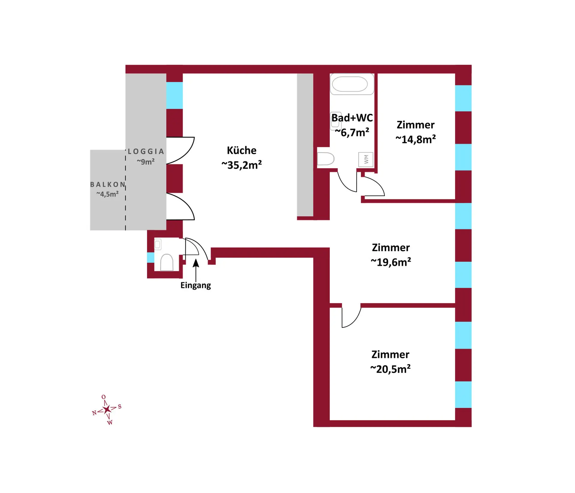 Die 3 Zi. Wohnung mit ca. 98 m² Wohnfläche und ca. 13,51 m² Außenfläche teilt sich wie folgt auf: