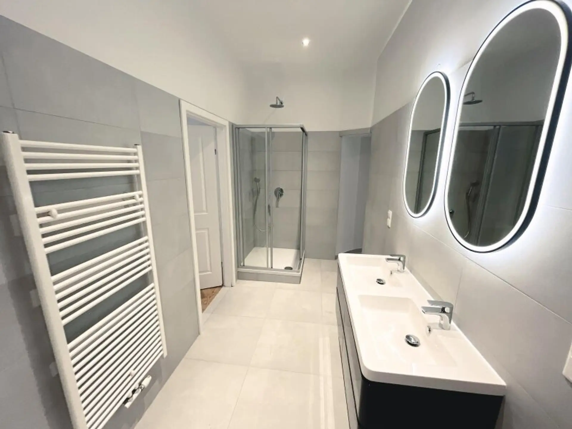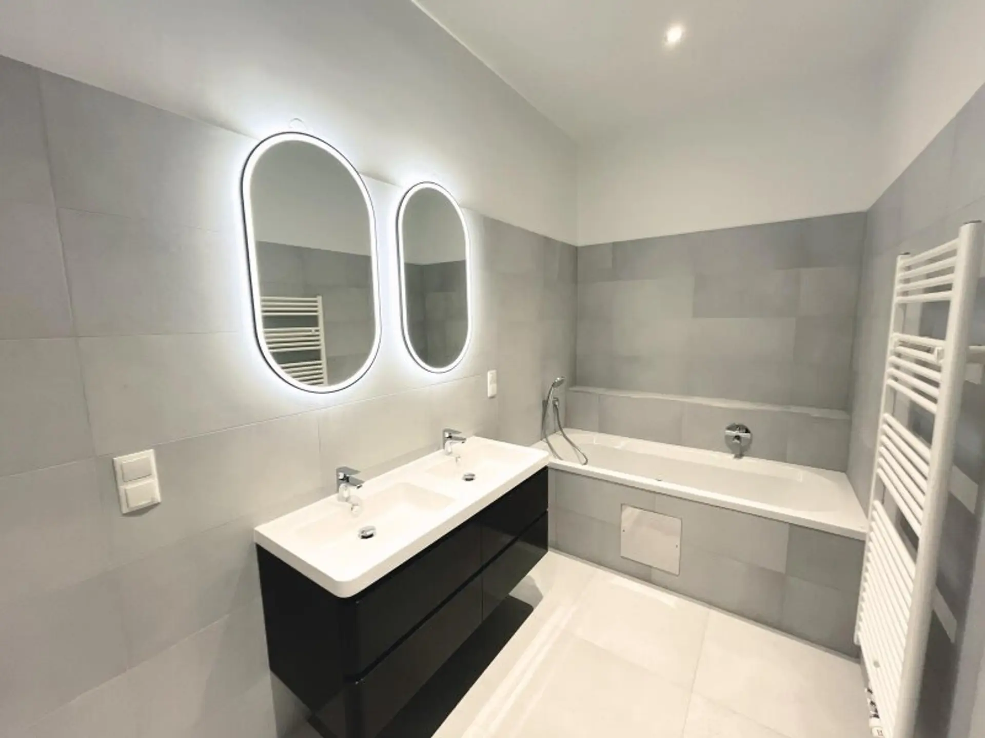 * Badezimmer mit Badewanne und Doppelwaschbecken
