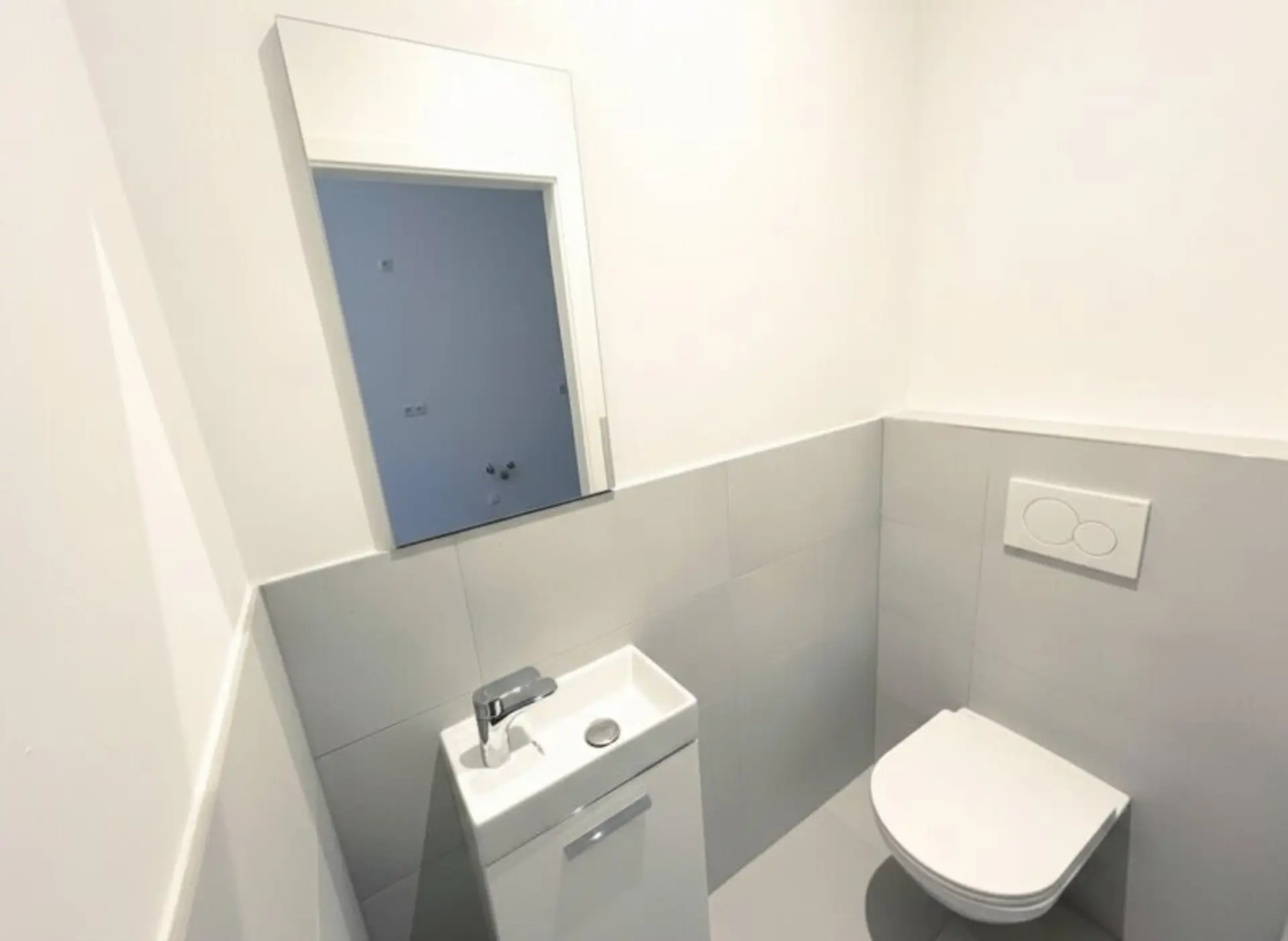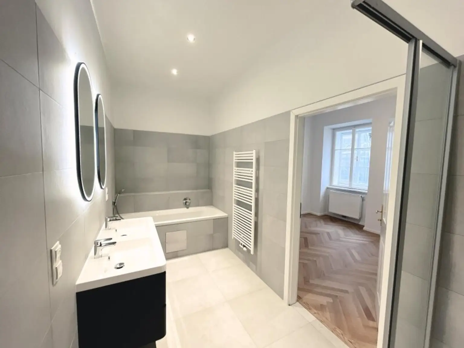 Das Herzstück der Wohnung bildet der offen gestaltete Wohn- und Essbereich mit Platz für eine moderne Küche. Von hier aus gelangt man direkt in das ruhige Schlafzimmer mit anschließendem Badezimmer. Das Bad ist zusätzlich über einen separaten Gang mit dem zweiten Schlafzimmer verbunden und überzeugt mit einer Badewanne sowie einem Doppelwaschbecken mit zwei eleganten Spiegeln.