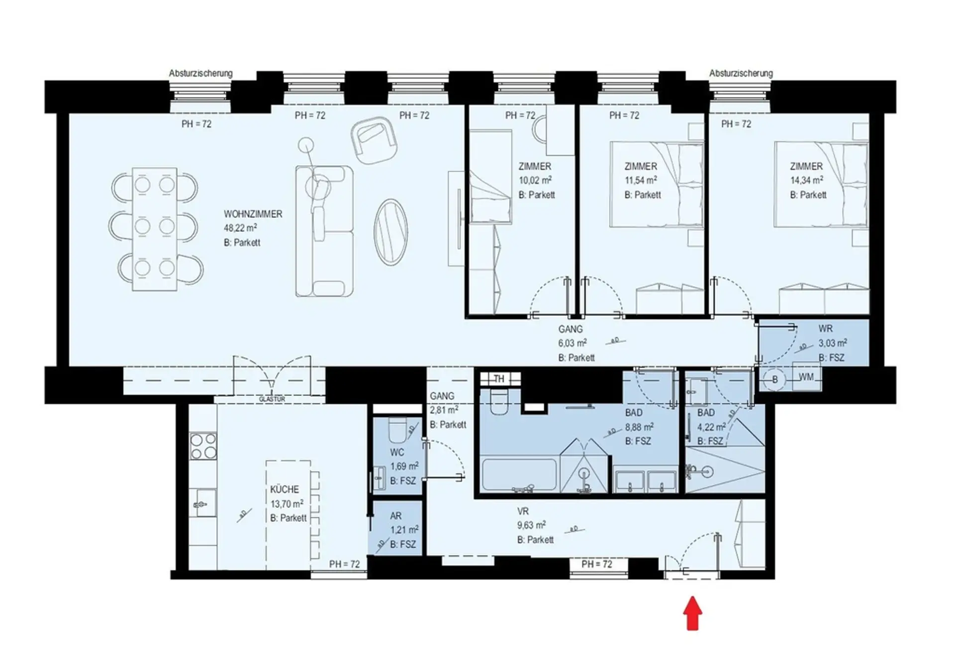 - hochwertige Echtholzparkettböden in Wohnräumen