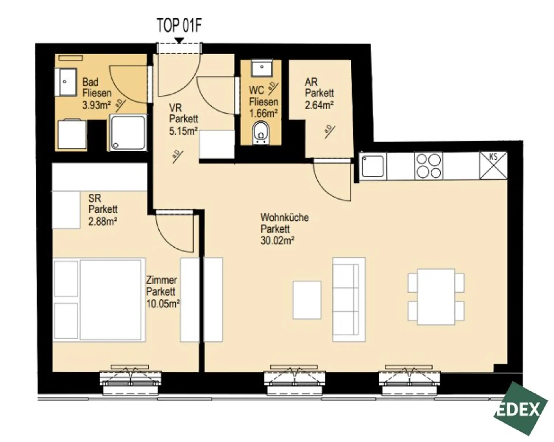 Der durchdachte Grundriss bietet einen kompakten Vorraum, ein modernes Badezimmer mit Dusche und Waschmaschinen-Anschluss, ein separates WC, ein Schlafzimmer sowie ein großes Wohnzimmer mit Wohnküche. Die Küche ist vollständig ausgestattet und verfügt noch über einen zusätzlichen Abstellraum.