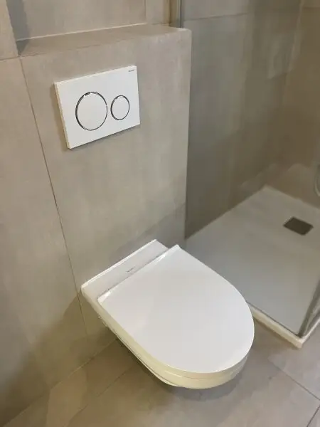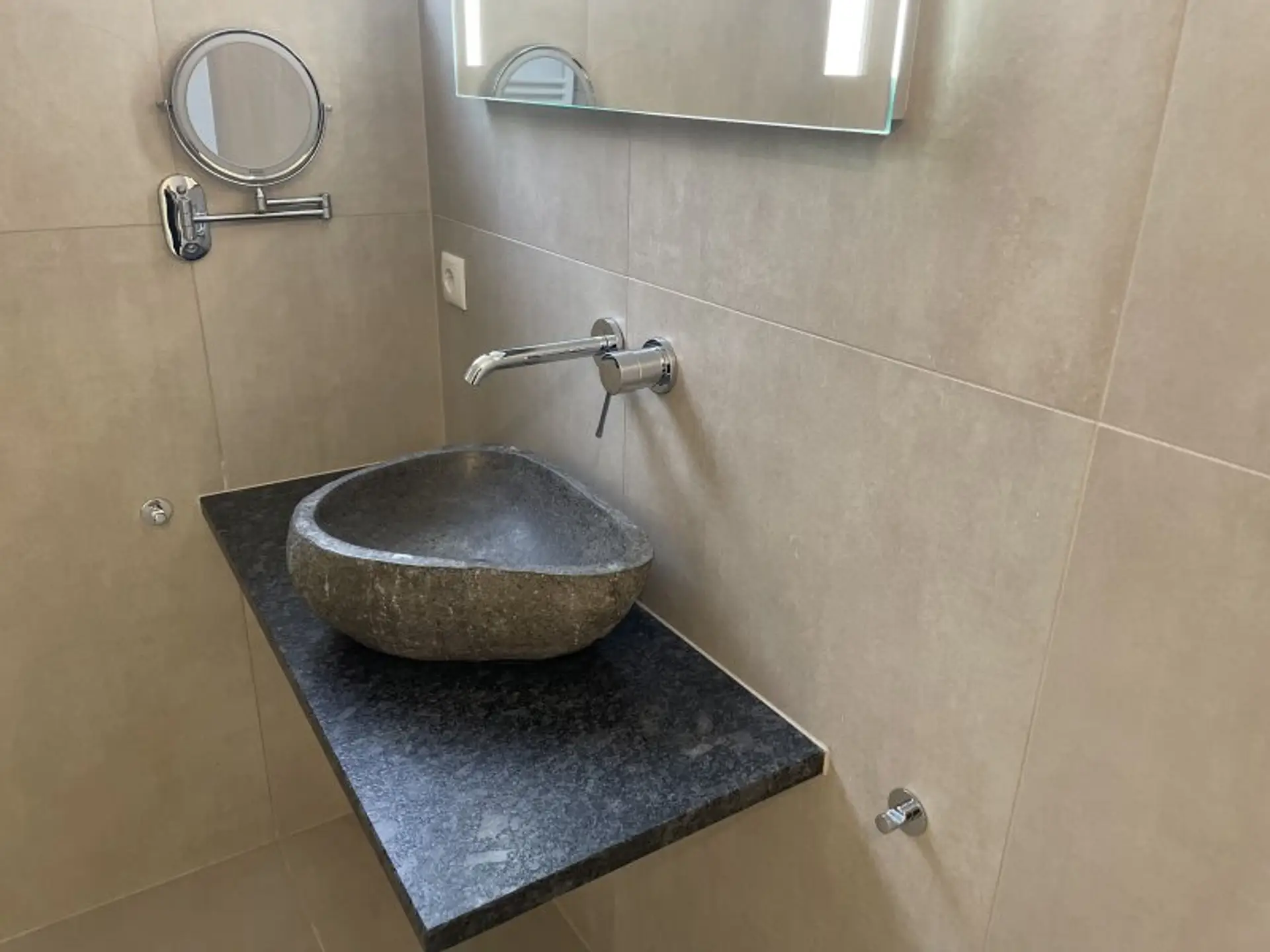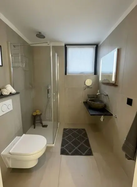 * Badezimmer: Hochwertige Dusche, WC, Design-Waschbecken, Waschmaschinenanschluss und Fenster zum Durchlüften