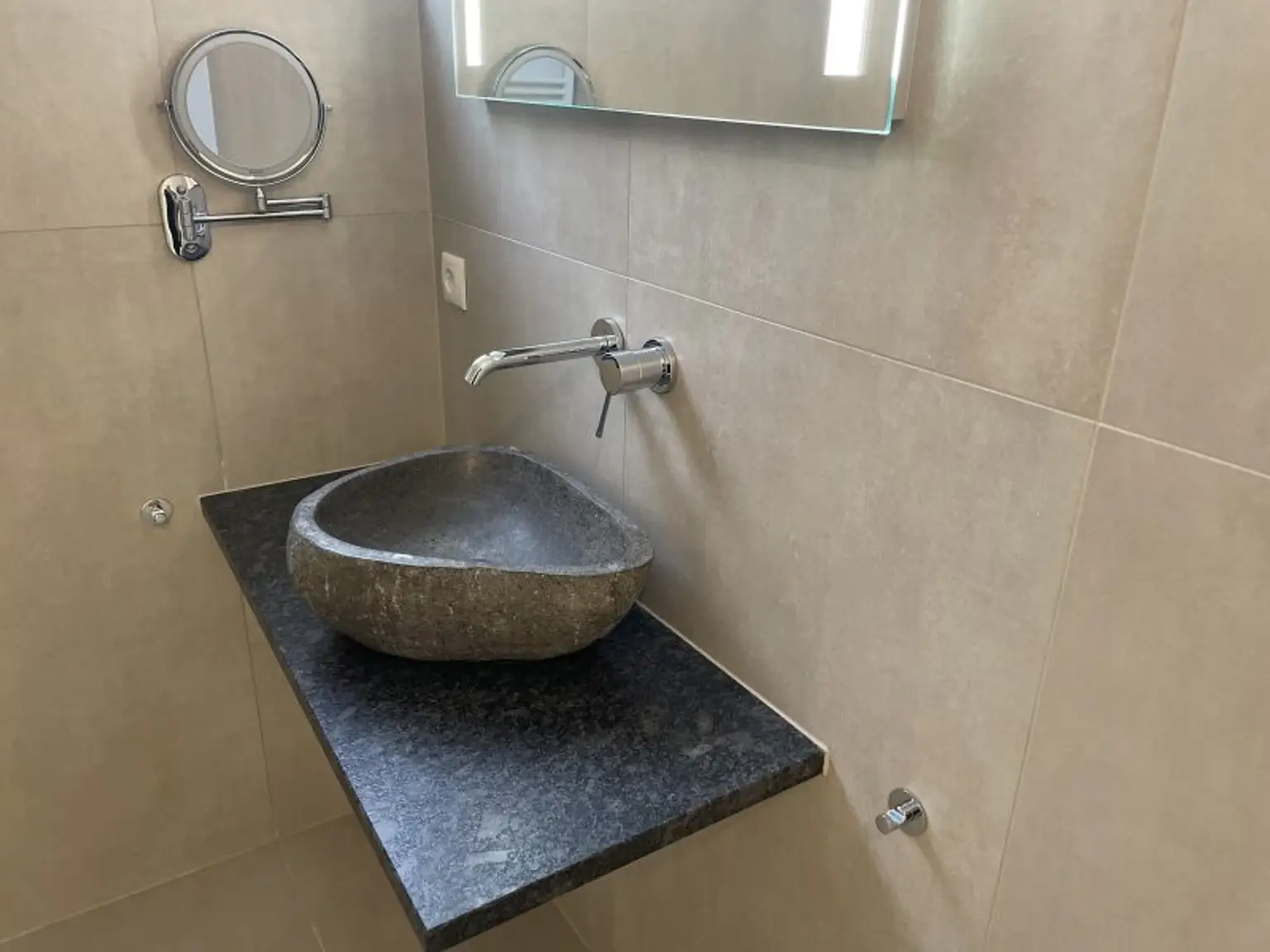 Das Bad punktet mit Markenqualität: Steinwaschbecken, "Hansgrohe" Armaturen, "Villeroy & Boch" sowie "Geberit/Duravit" Ausstattung.