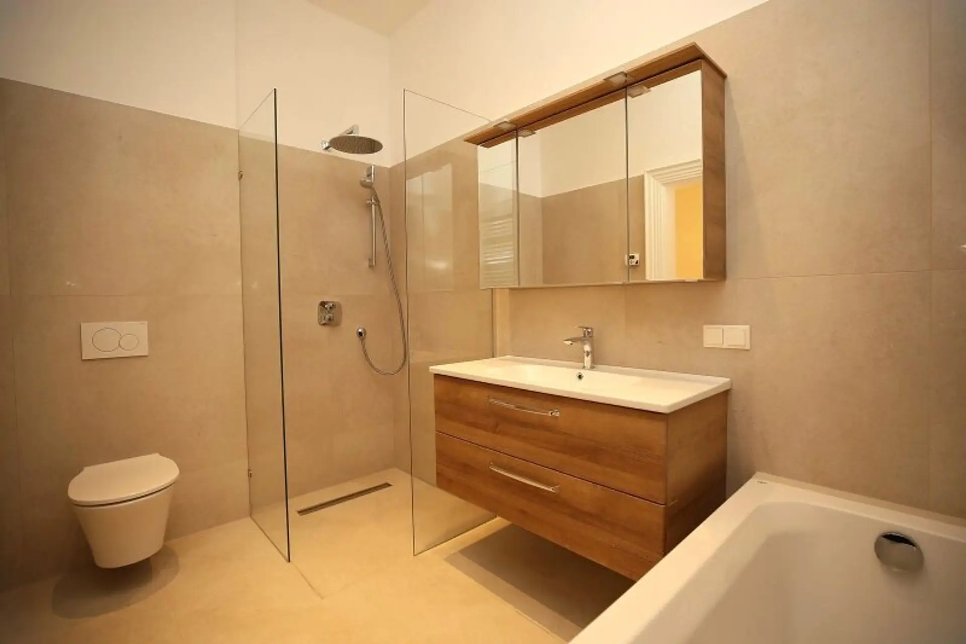 1 Badezimmer möbliert mit Dusche, Badewanne und WC
