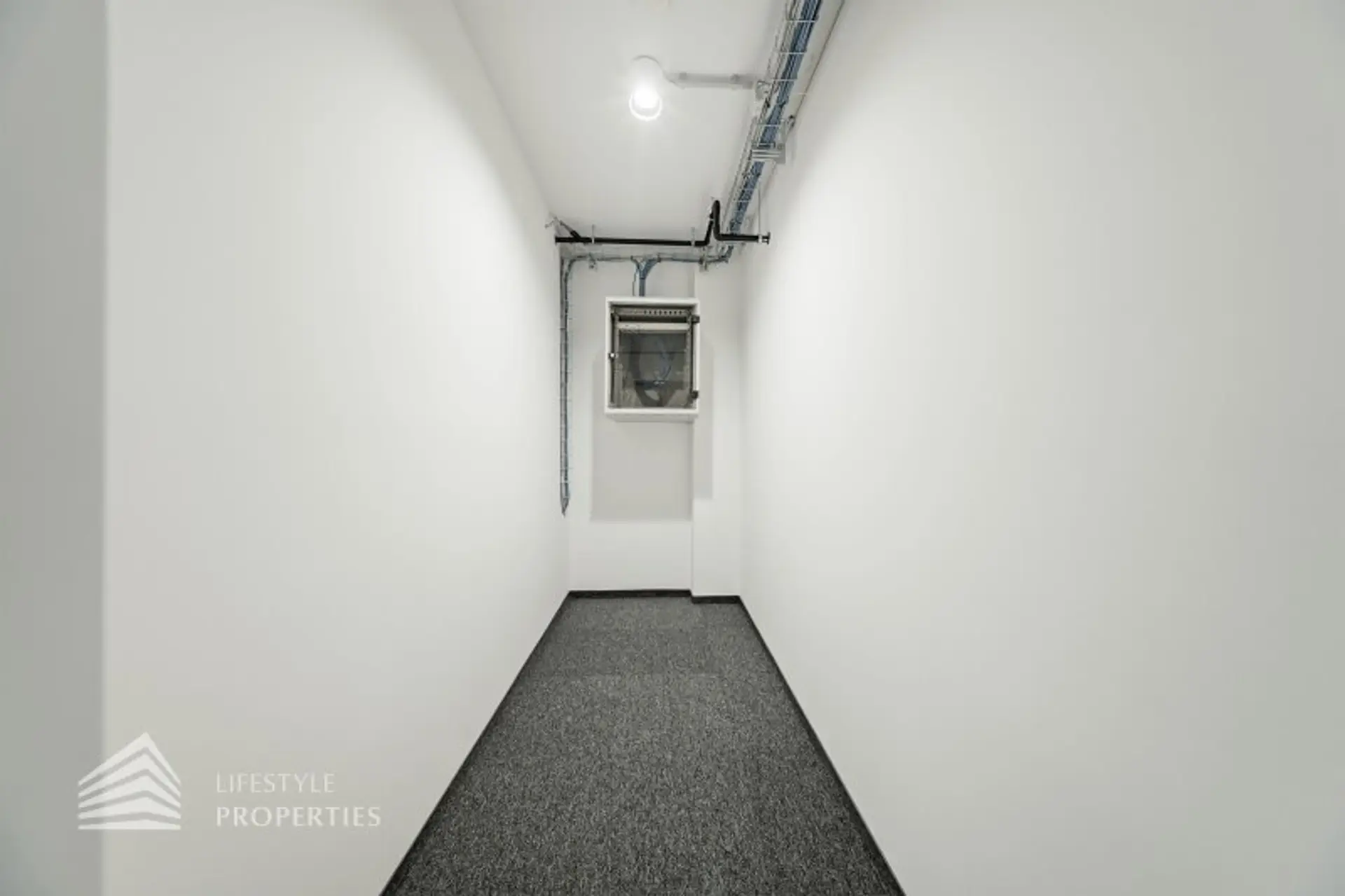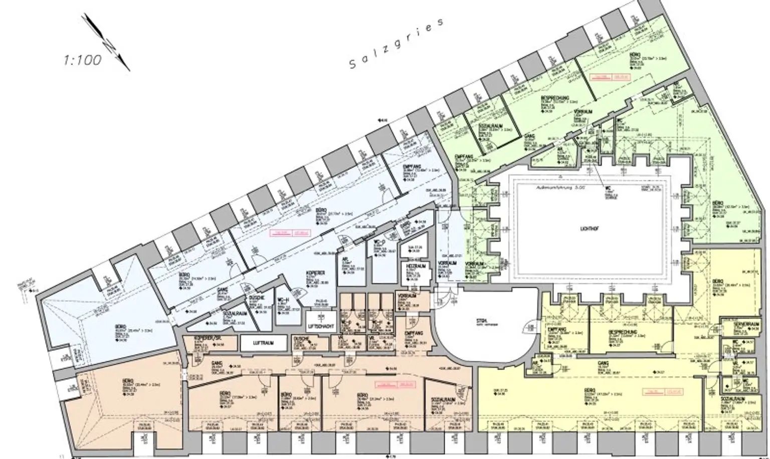 Beim Eingang befindet sich der ca. 13 m² große Empfang und ein Abstellraum. Durch einen ca. 14 m² langen Gang gelangt man zu den einzelnen Büroräumen. Am Ende des Ganges befindet sich ein Sozialraum mit einer Teeküche, die Toiletten für die Damen und Herren und ein Serverraum. Beim Empfang befindet sich zusätzlich ein Abstellraum. Die Fläche des Heizraumes wird auf vier Einheiten aufgeteilt.