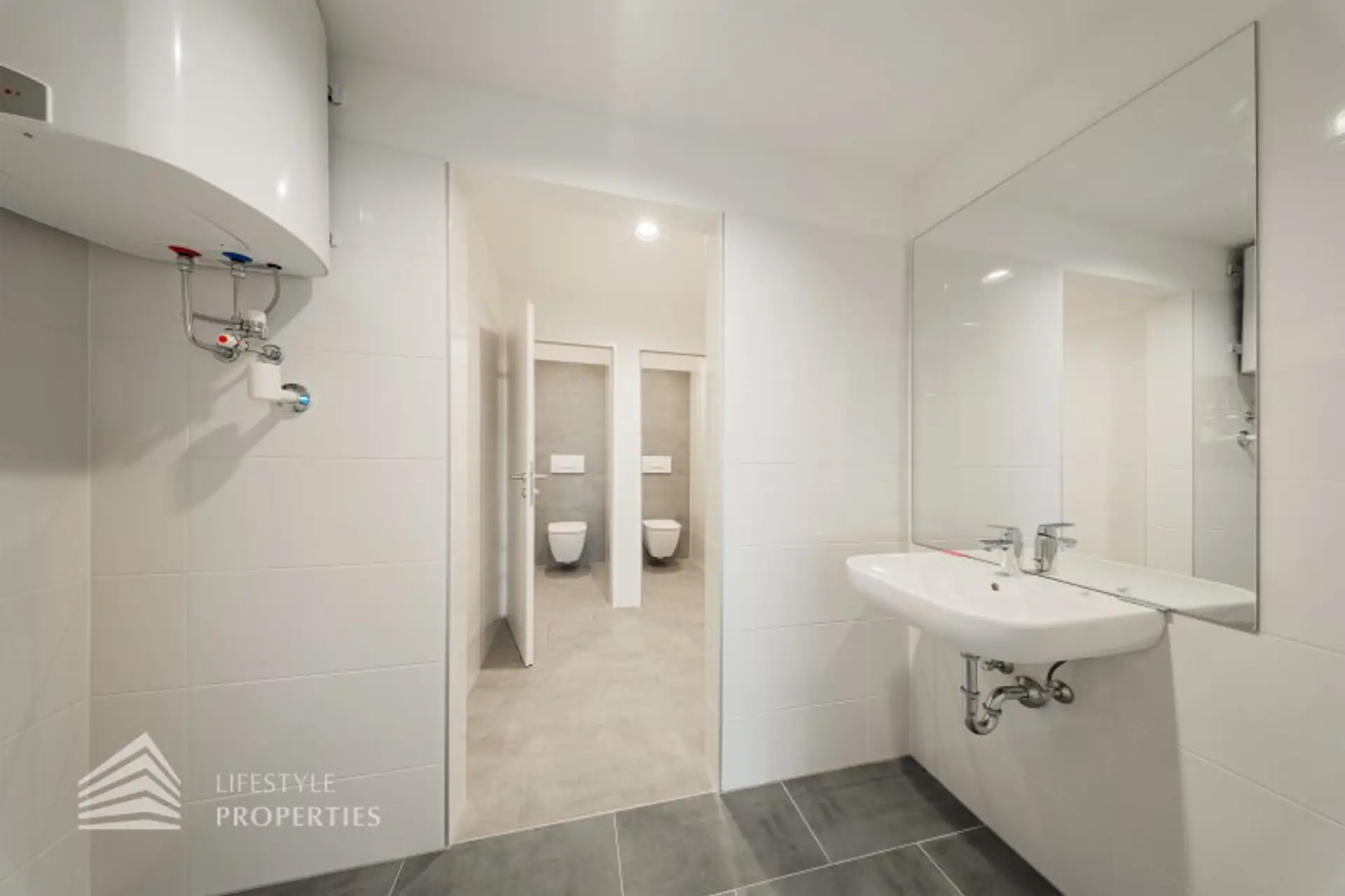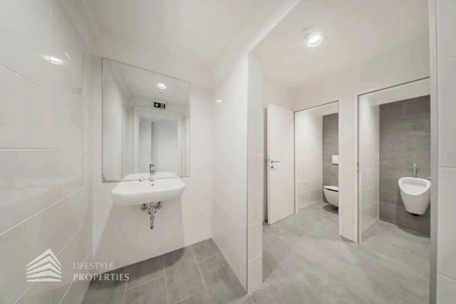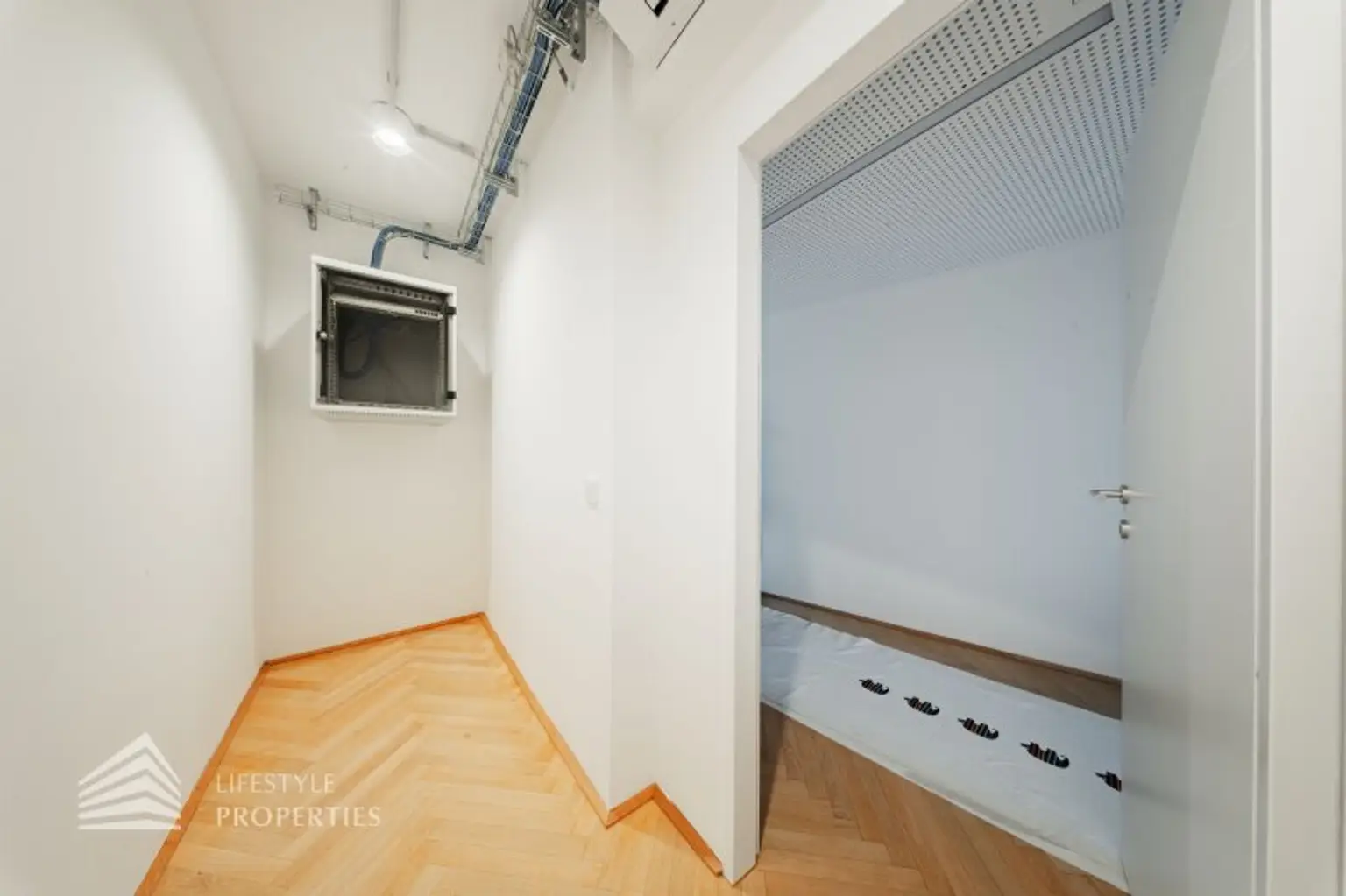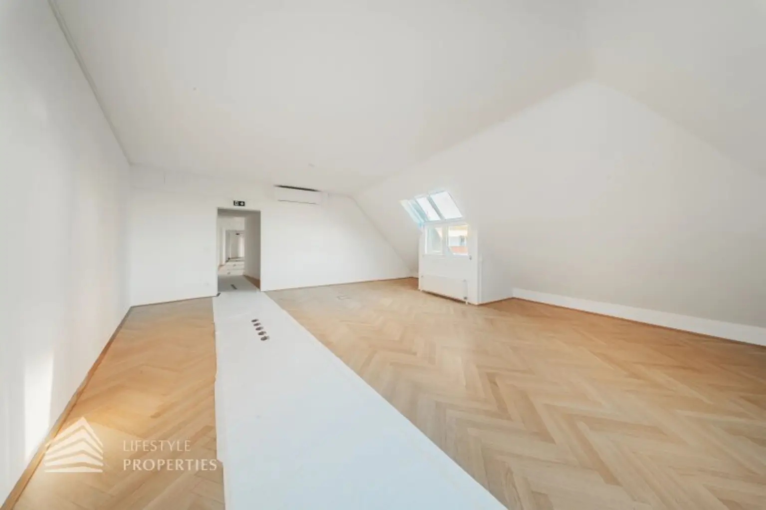 Beim Betreten des Büros befindet sich der ca. 4 m² große Vorraum mit einen ca. 25 m² großen Empfang. Rechts beim Eingang befinden sich die Toiletten für die Damen und Herren. Durch einen ca. 28 m² langen Gang gelangt man zu den einzelnen Büroräumen. Am Anfang des Ganges befindet sich ein Sozialraum mit einer Teeküche. Den Gang entlang befindet sich auf der rechten Seite ein Kopierraum und ein Badezimmer. Die Fläche des Heizraumes wird auf vier Einheiten aufgeteilt.