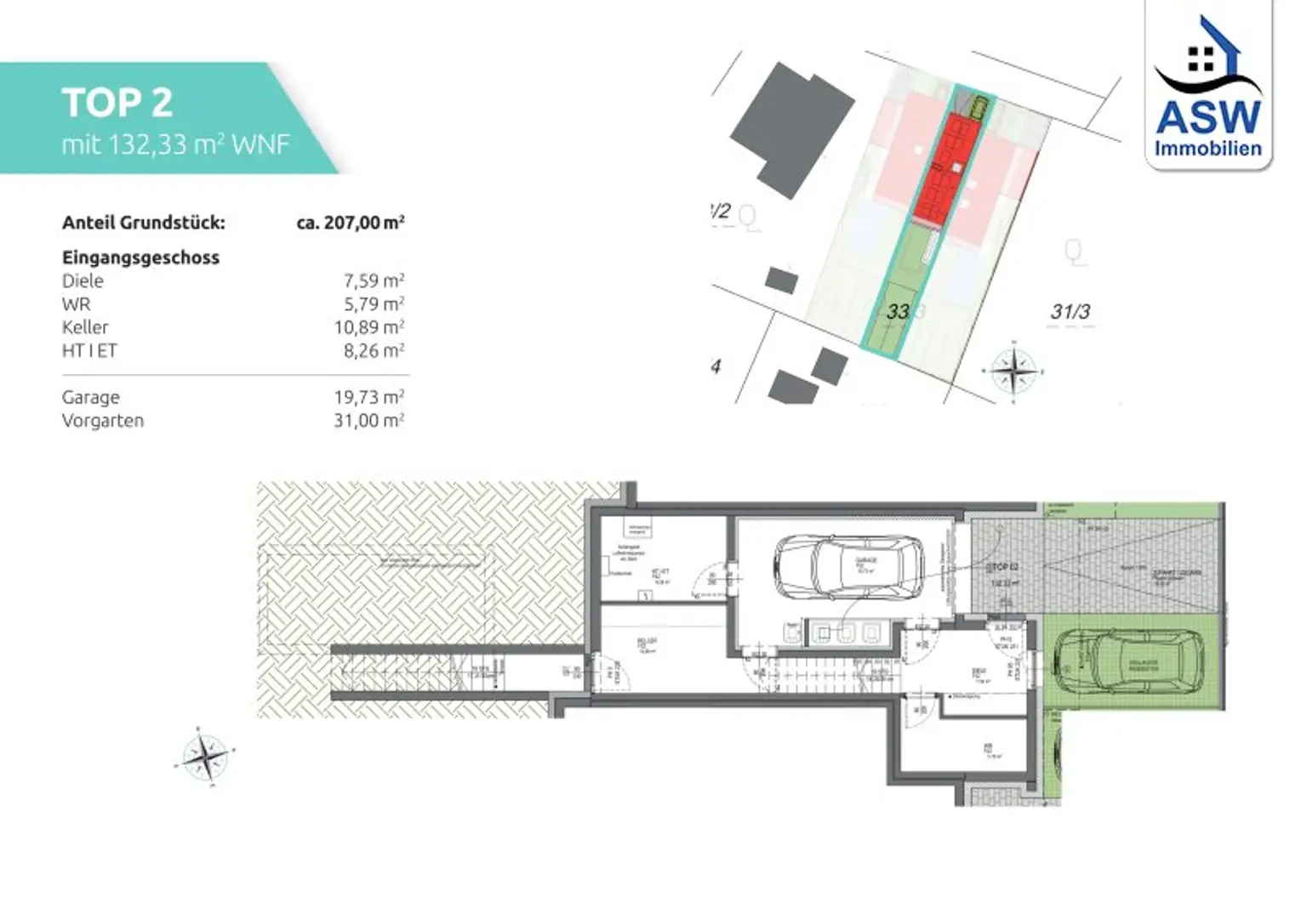 Vorgarten (Außenstellplatz + Einfahrt): 31,00 m²