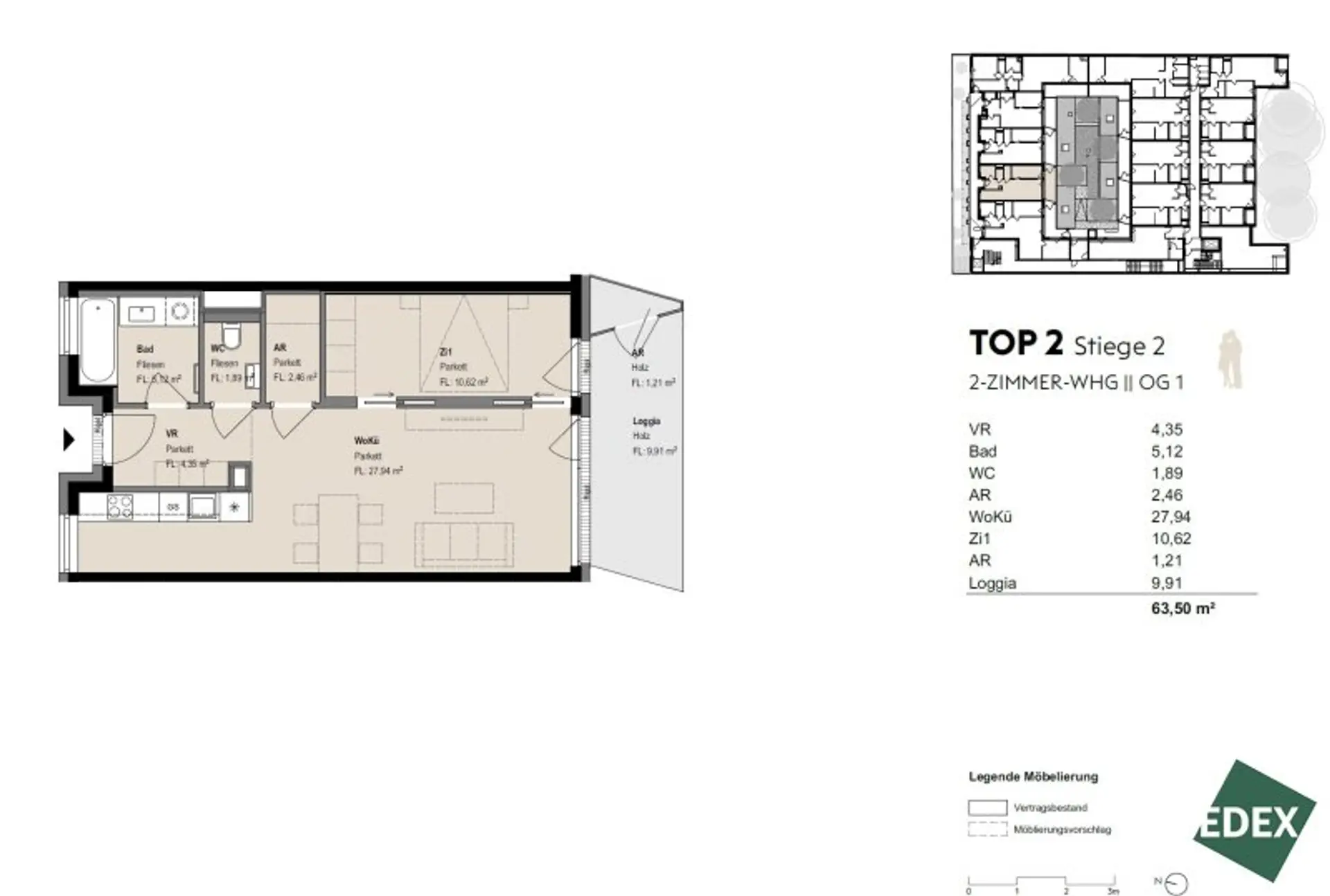 Zur Vermietung gelangt eine traumhafte 2-Zimmer-Wohnung. Die lichtdurchflutete Wohnung befindet sich im 1.Stock und verfügt über einen geräumigen Vorraum, einen Abstellraum, eine separate Toilette mit Handwaschbecken, ein Badezimmer mit Badewanne und Waschmaschinenanschluss, eine moderne, großzügige, mit Miele-Geräten ausgestattete Wohnküche sowie über ein Schlafzimmer. Die traumhafte Loggia ist sowohl über das Wohnzimmer als auch über das Schlafzimmer begehbar. Zudem ist der Wohnung ein externer Lagerraum zugeordnet, welcher für weiteren Stauraum sorgt. Im Haus befinden sich Kinderwagen- und Fahrradabstellräume sowie eine Tiefgarage. Die Wohnung steht ab sofort zur Verfügung und wird auf 5 Jahre befristet vermietet.