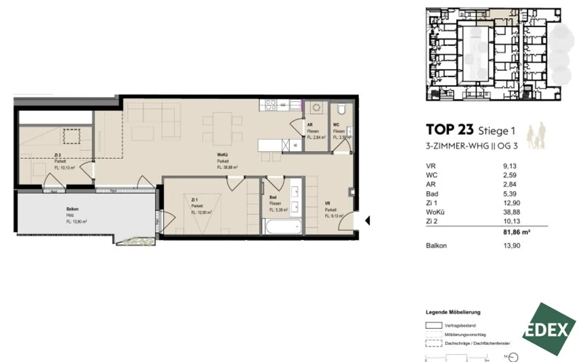 * Jede Wohnung verfügt über eine Freifläche (Balkon, Loggia oder Terrasse)