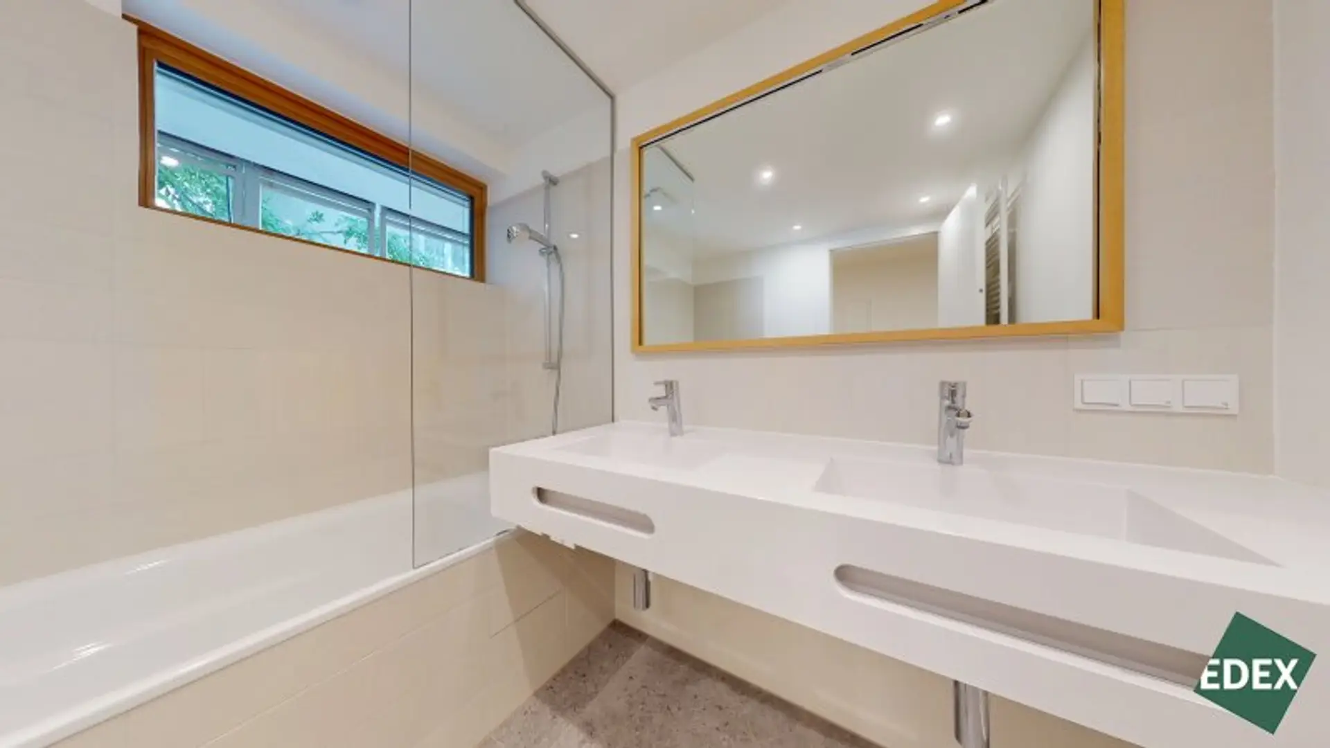 Ein außenliegender Sonnenschutz (fassadenintegrierte Raffstores) hält die Räume auch im Sommer angenehm kühl – im Dachgeschoss zusätzlich unterstützt durch moderne Klimageräte.